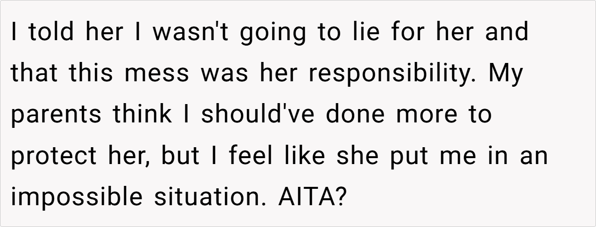 OP’s parents think they should have “protected” their sister, but what does that even mean? Does family loyalty mean lying for someone, even when they’ve done something objectively wrong?
