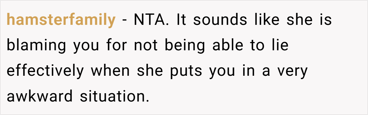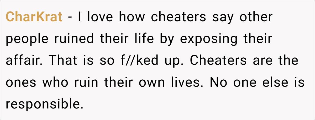 - Cheaters Often Shift Blame – OP’s sister is a textbook example of how people rationalize their wrongdoing. Rather than taking responsibility, she’s lashing out at those who won’t lie for her.