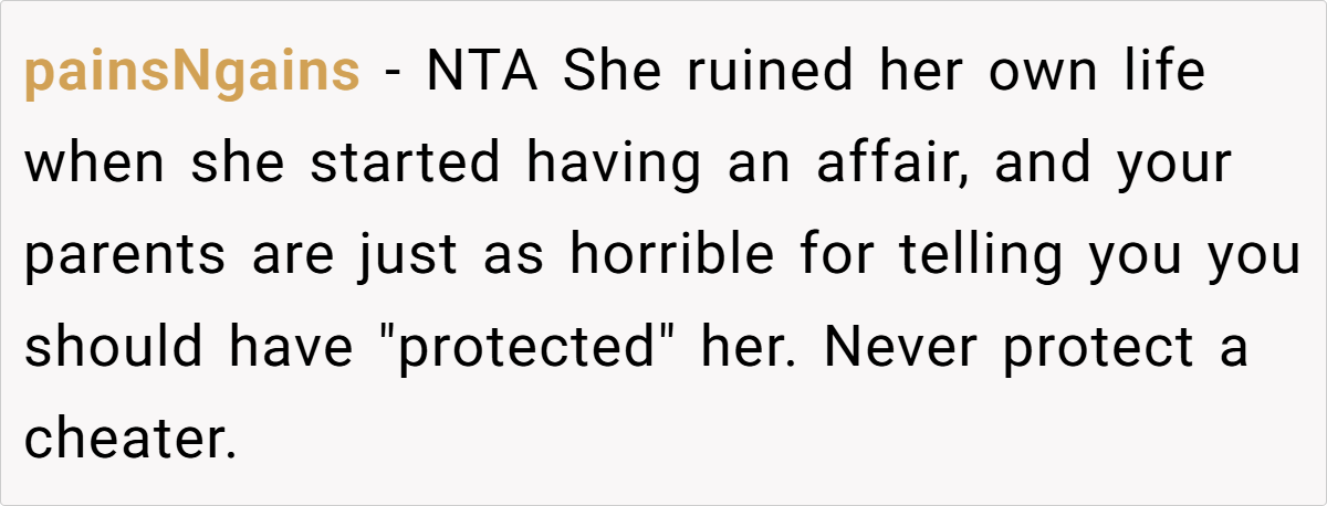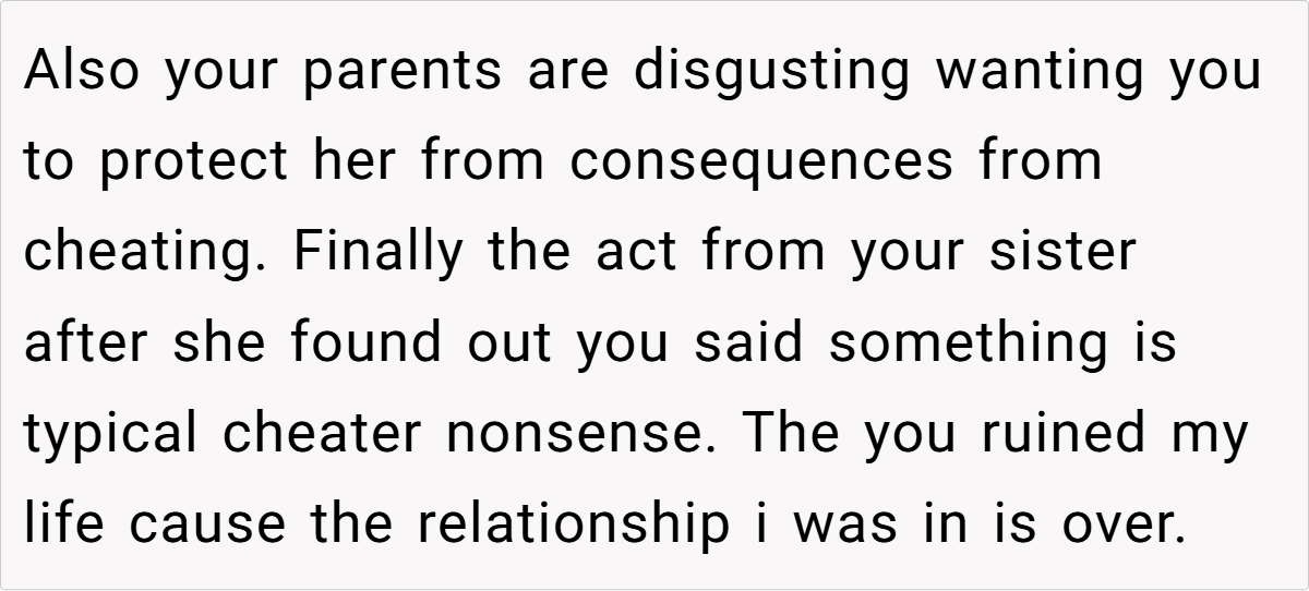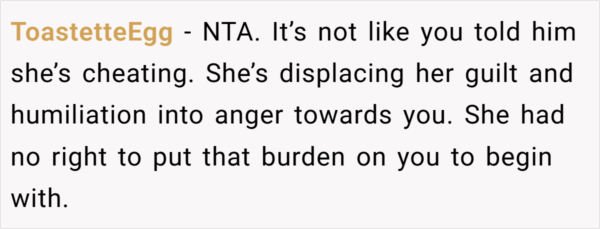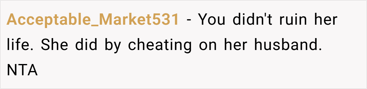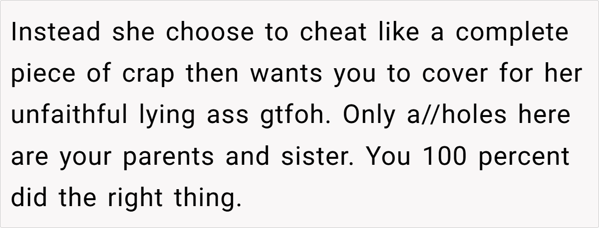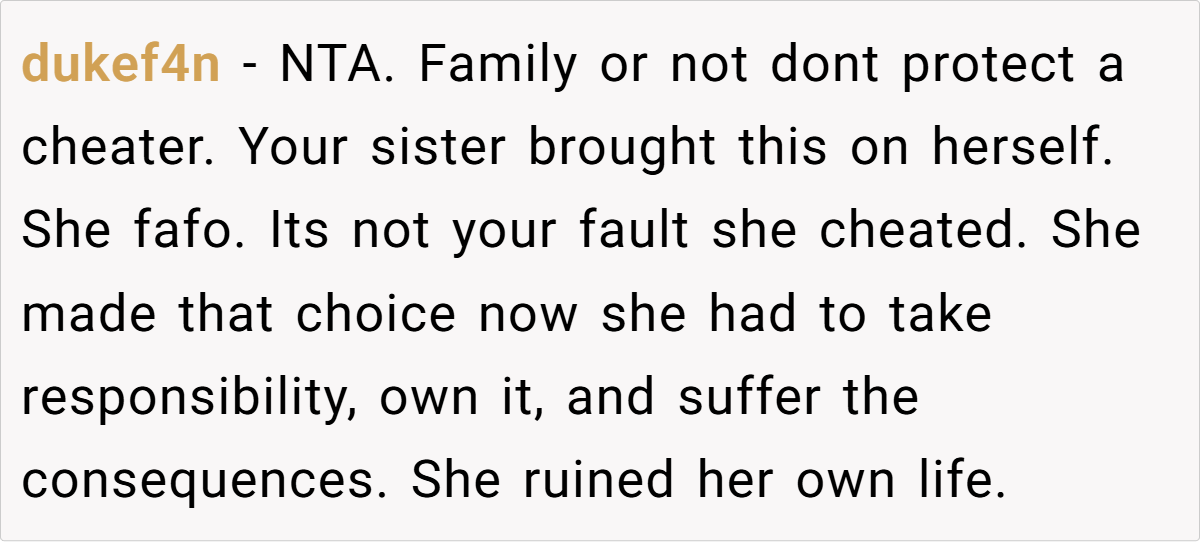 Unsurprisingly, Reddit overwhelmingly sided with OP. Many pointed out that the sister ruined her own life, not OP. Others highlighted the absurdity of cheaters blaming those around them for exposing the truth.