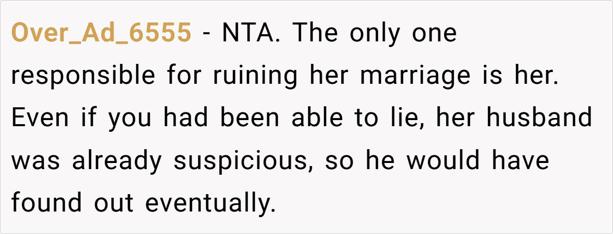 - Truth Comes Out Eventually – Even if OP had covered for their sister, the husband was already suspicious. The affair would have come to light one way or another.