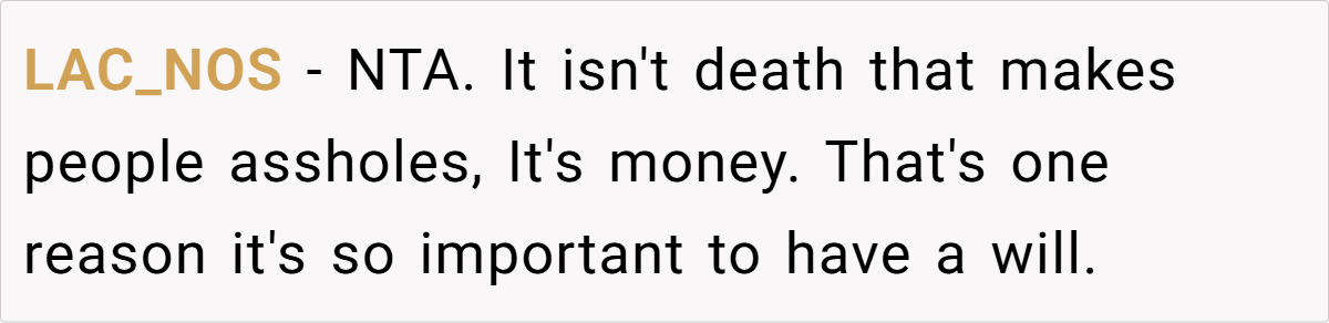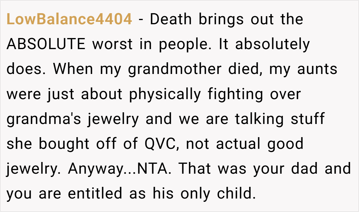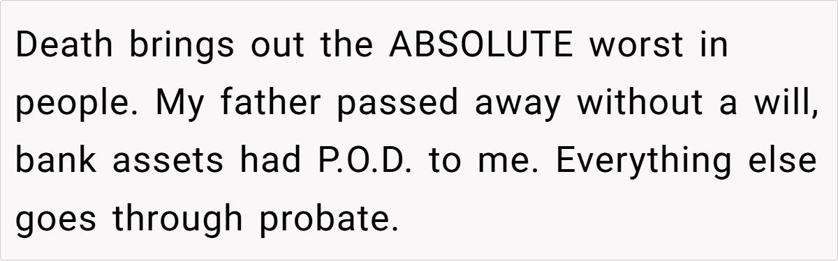 Death has a way of bringing out the worst in people—especially when money is involved. One Redditor shared their experience of losing their father, only to have their own family contest their inheritance, claiming they weren’t the biological child.