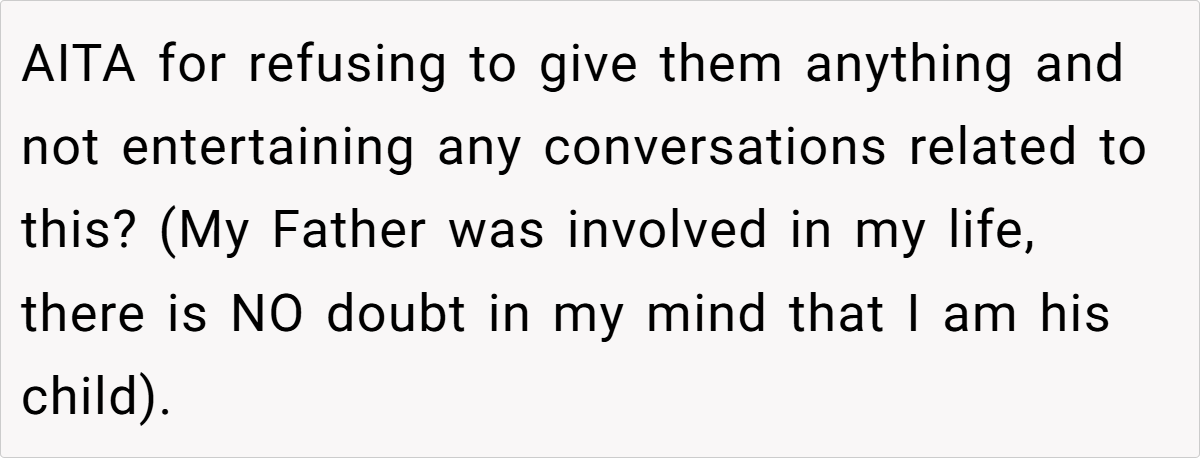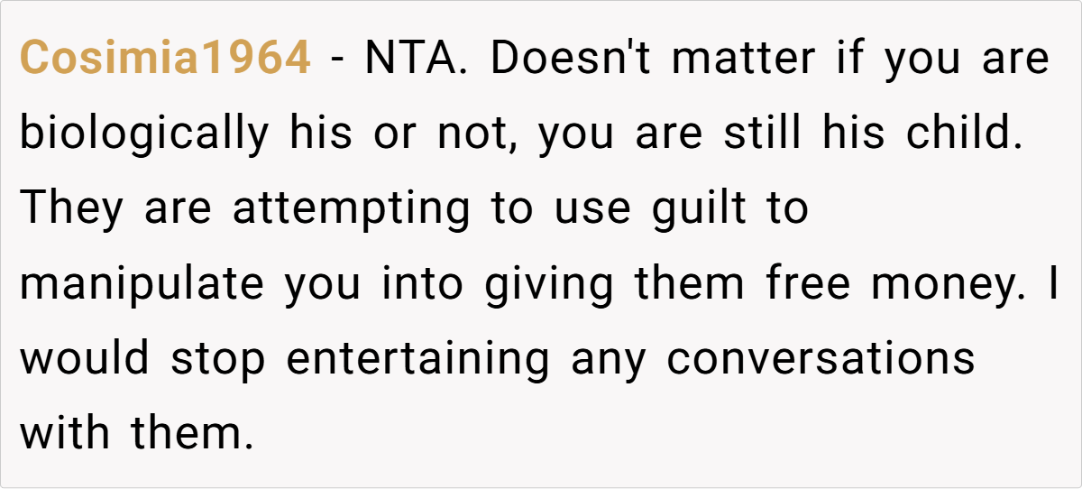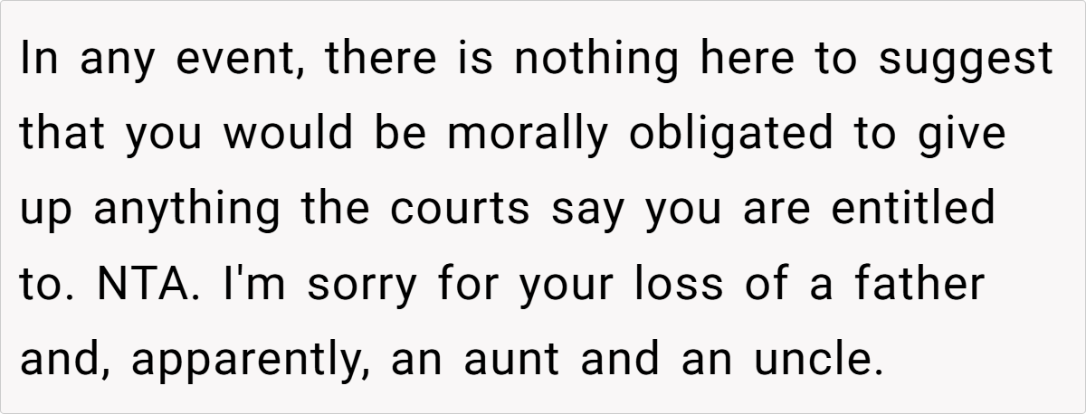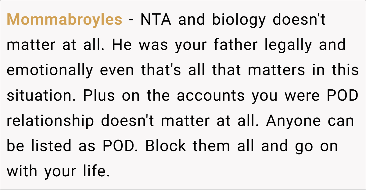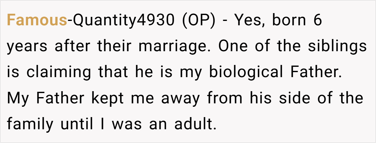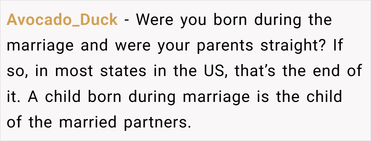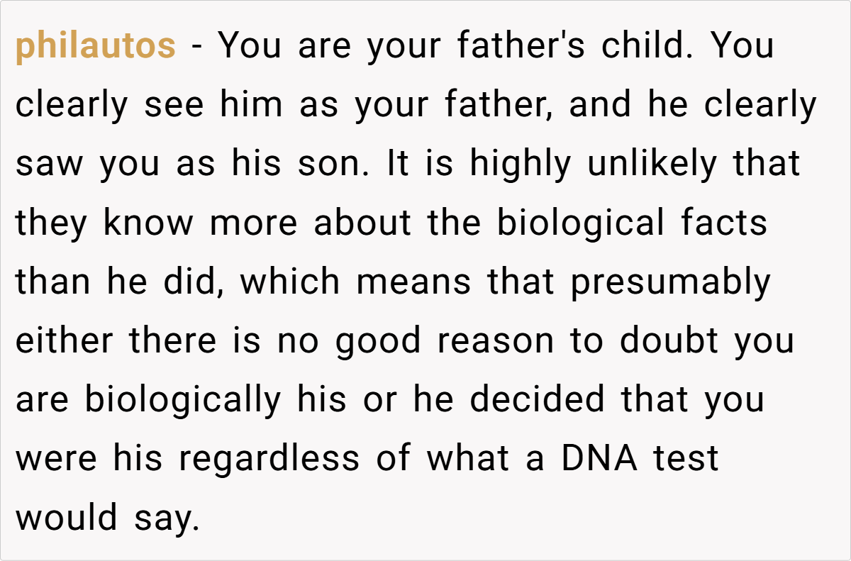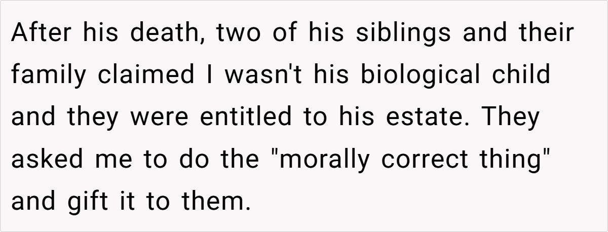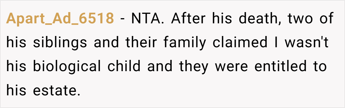 Beyond the legal realm, morality comes into play. Some might argue that, if the family truly believed OP wasn’t their father’s biological child, they might have a right to contest. But others argue that blood alone doesn’t determine family.