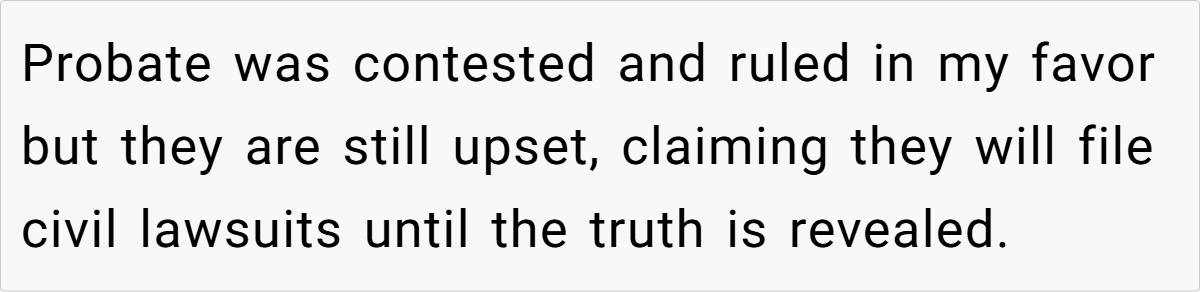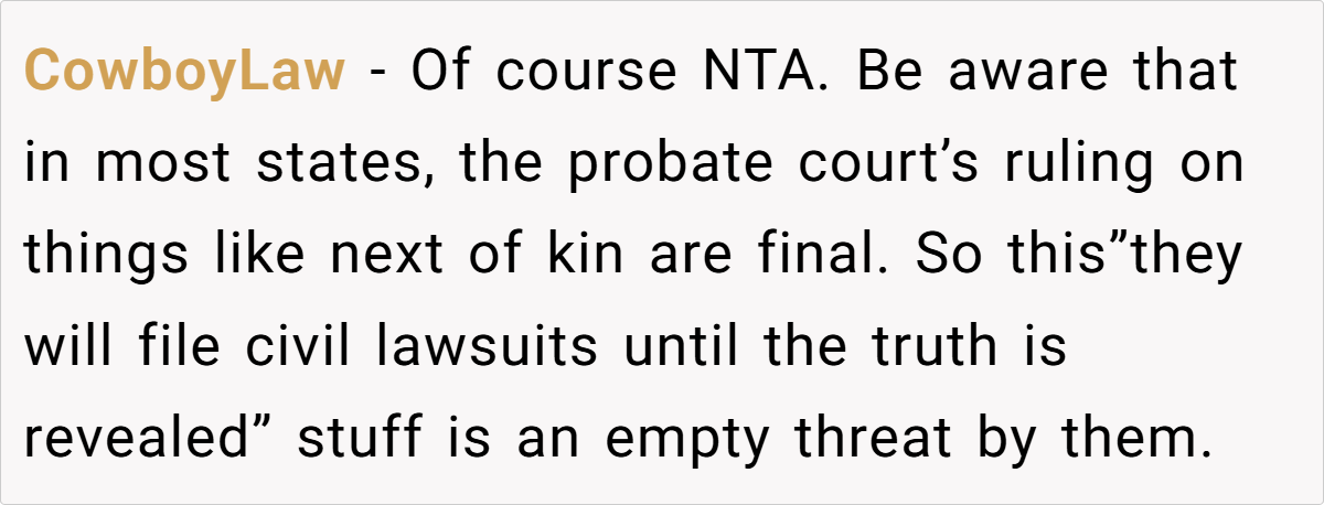 Additionally, the probate ruling in OP’s favor is likely final. Attorney Andrew Weisblatt explains, “Once a probate court rules on an inheritance case, further civil lawsuits contesting paternity or inheritance rights are typically dismissed unless new, substantial evidence is presented.”