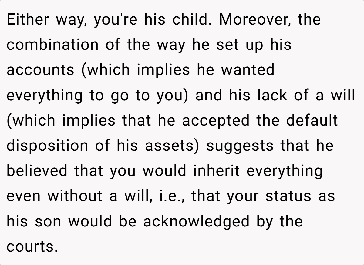 Inheritance disputes, especially in cases without a will, can be messy. However, OP’s situation seems legally airtight. According to Estate Attorney Jacob Stein, “If a child was born during a legal marriage, they are presumed to be the biological child of the couple, and unless there is overwhelming evidence proving otherwise, they are entitled to inheritance rights.”