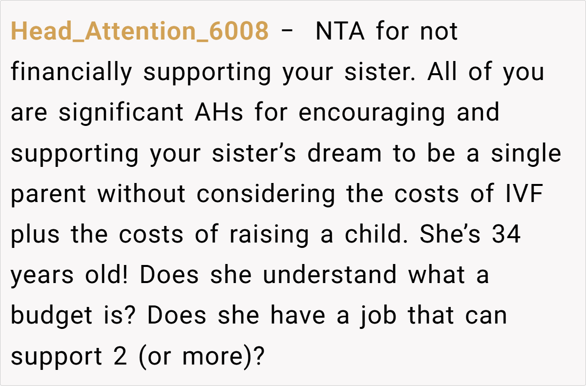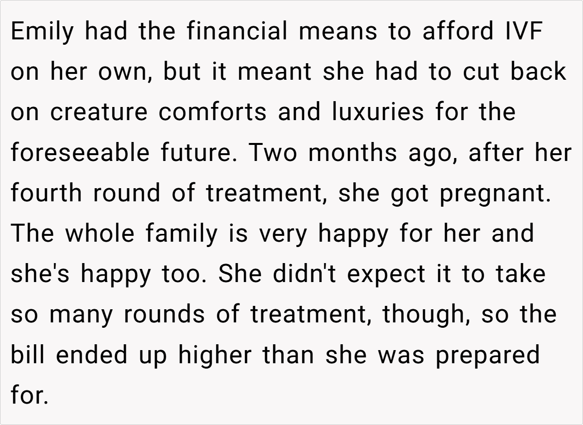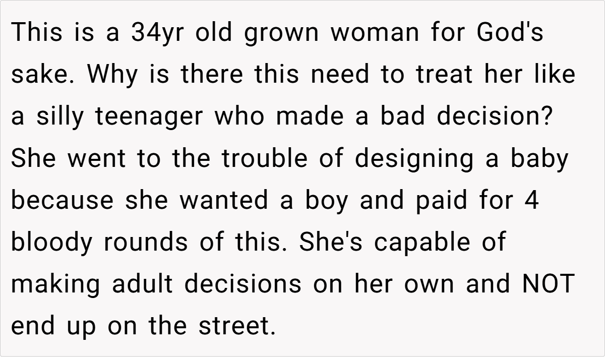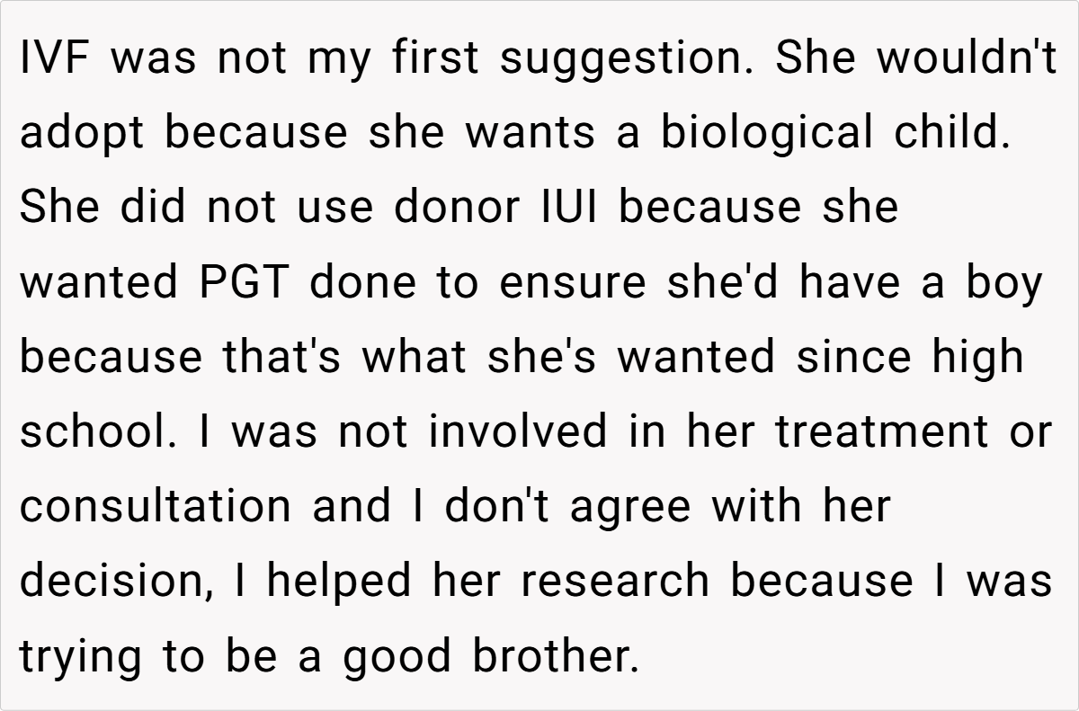 The sentiment is that Emily chose IVF and must accept the financial consequences of that choice without expecting a bailout. Some even view her expectations as entitled, noting that her decision to pursue a specific, high‑cost treatment (with the goal of having a biological boy) further underscores her personal responsibility. In short, most agree that the brother’s boundaries are justified, given his own family’s needs and goals.