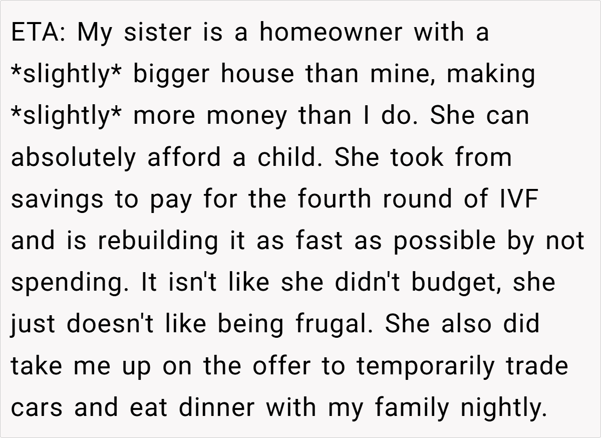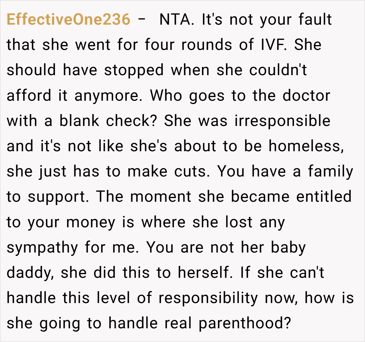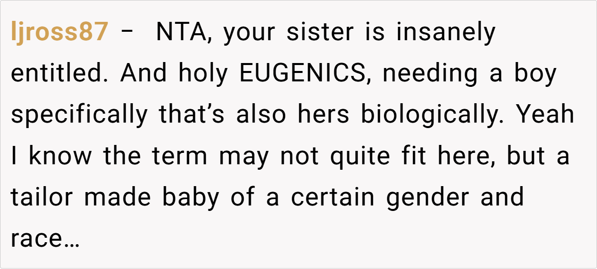 The sentiment is that Emily chose IVF and must accept the financial consequences of that choice without expecting a bailout. Some even view her expectations as entitled, noting that her decision to pursue a specific, high‑cost treatment (with the goal of having a biological boy) further underscores her personal responsibility. In short, most agree that the brother’s boundaries are justified, given his own family’s needs and goals.