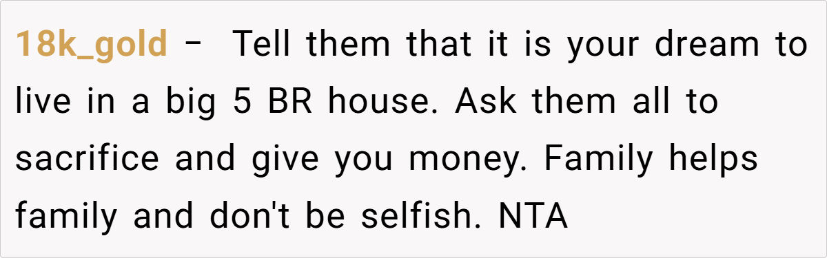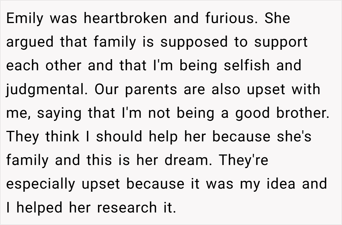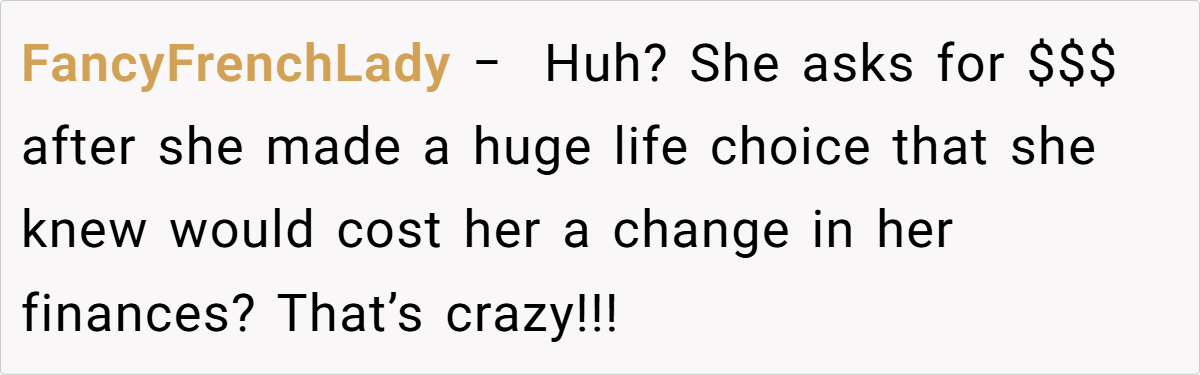 What do you think? Should family members be expected to financially back personal decisions, or is it fair to draw a hard line when it comes to supporting one’s own dreams? Share your thoughts and experiences below.
