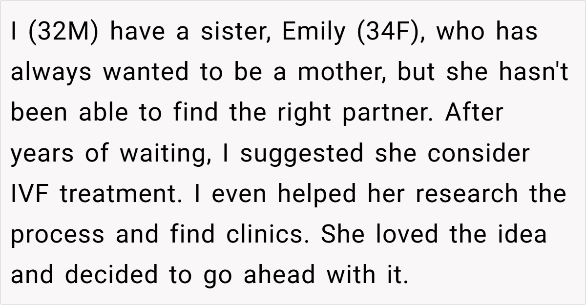 Family can be a beautiful support system—but sometimes, their expectations can feel overwhelming. In this modern tale, a 32‑year‑old man finds himself caught between his sister Emily’s burning desire to be a mother and the financial realities of her chosen path. Emily, 34, has pursued IVF with relentless determination after years of waiting for the right partner.