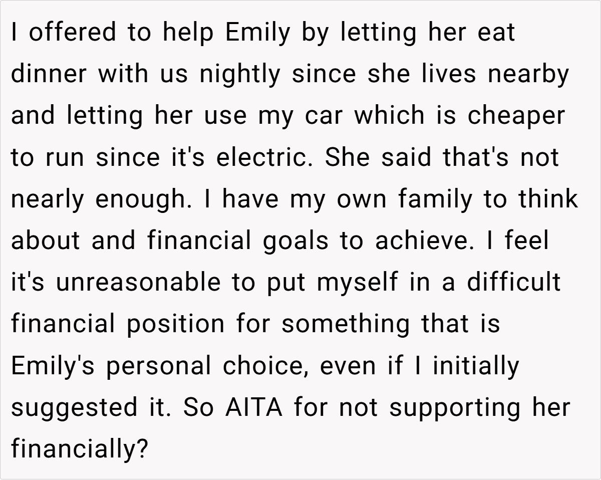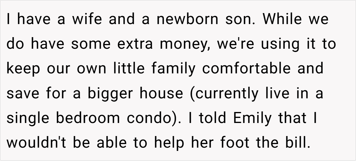 With his own wife and newborn son, and aspirations to upgrade his living situation, diverting funds to cover Emily’s extra expenses could jeopardize his family’s future. “Healthy boundaries mean recognizing that while family is important, personal financial security is equally critical,” adds Dr. Gottman. He warns that extended family pressure, if unchecked, can lead to resentment and long-term emotional strain.