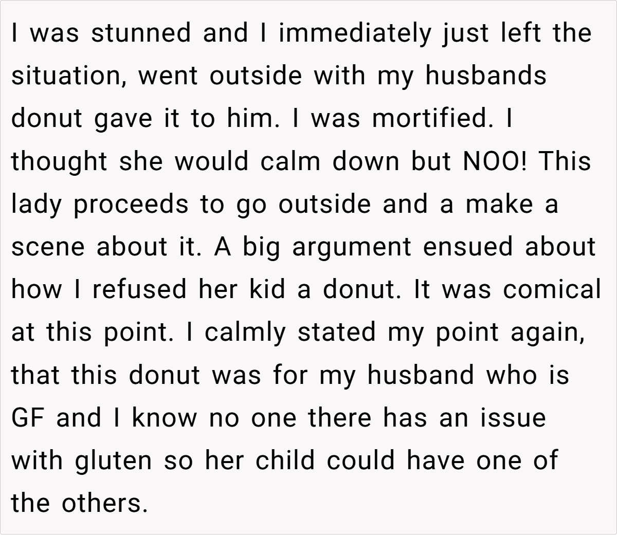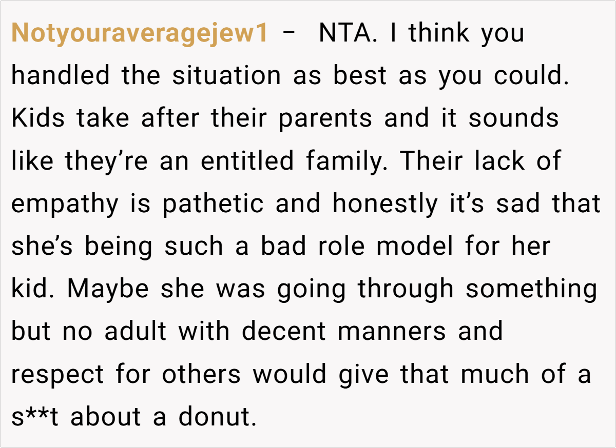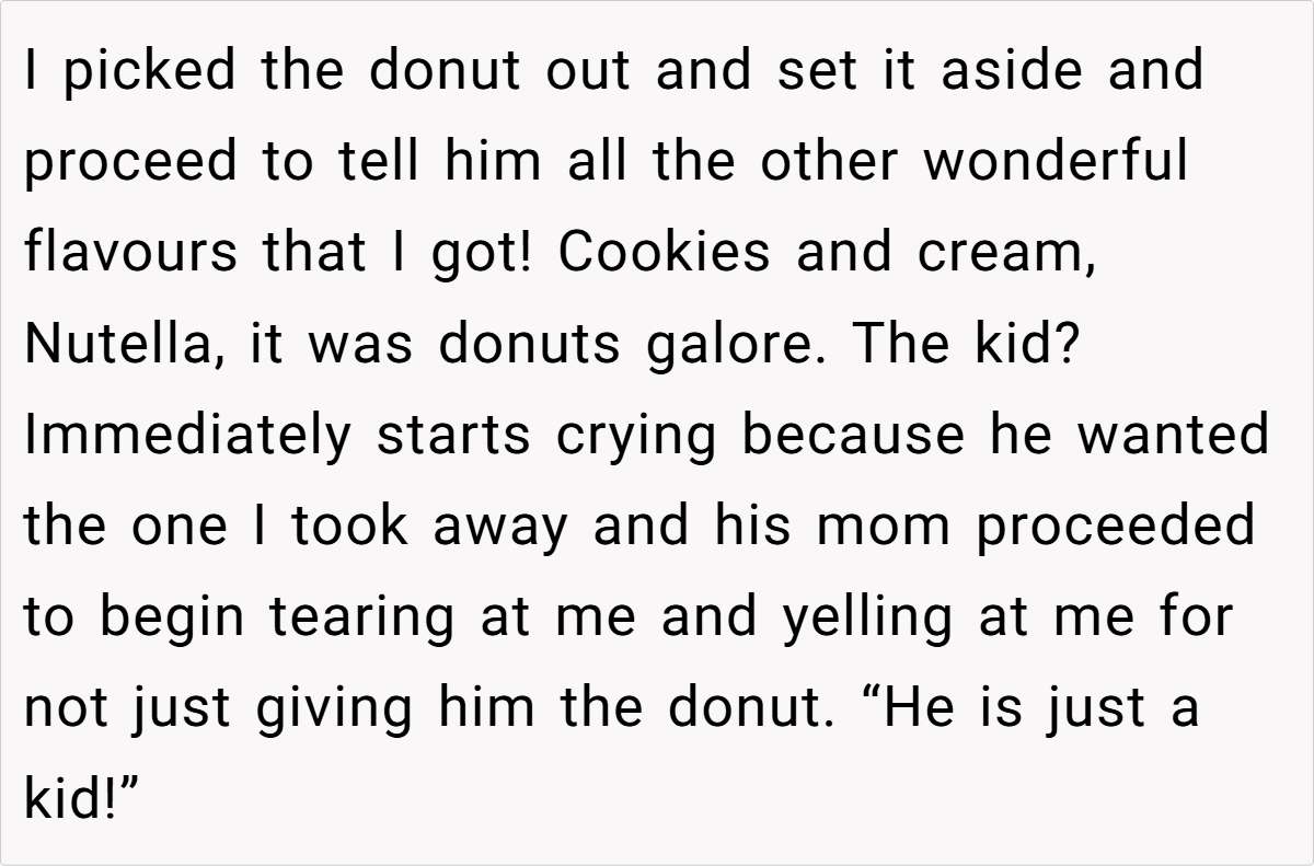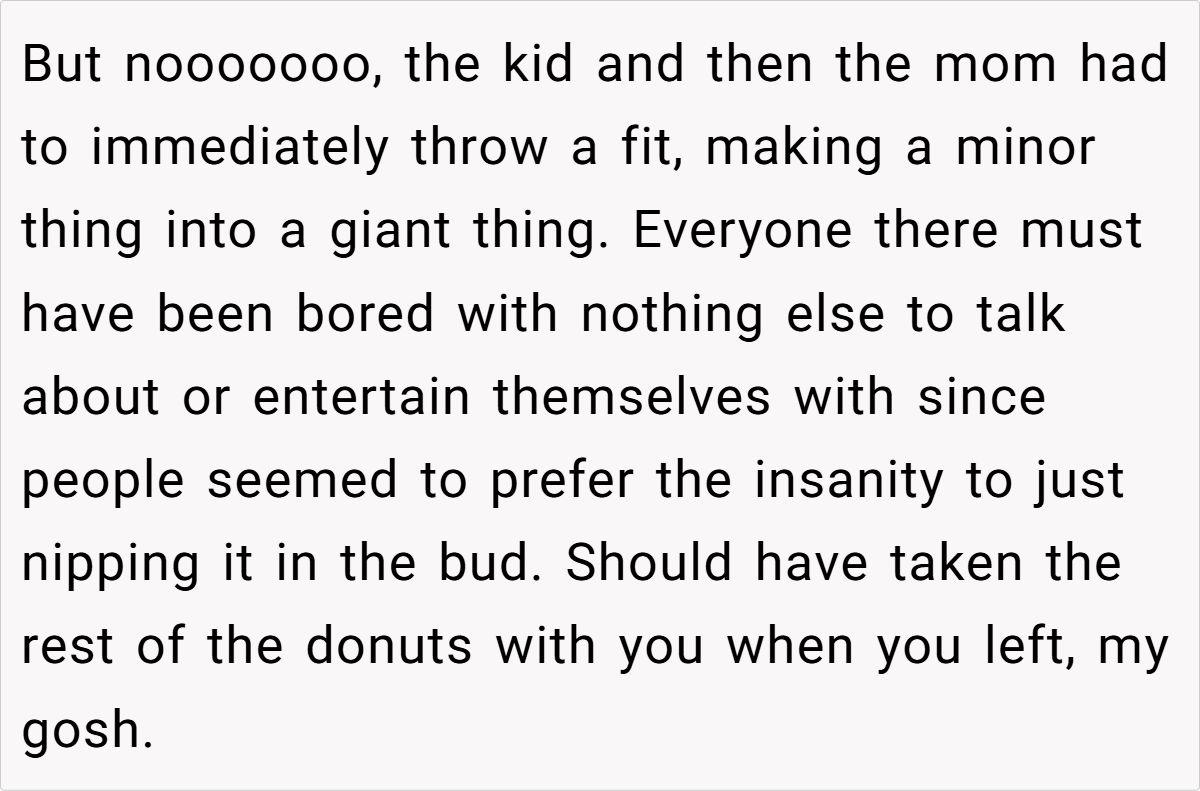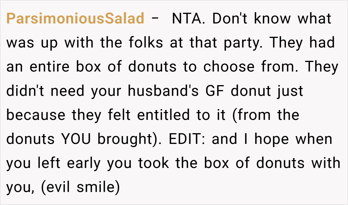 In this instance, the OP’s decision to safeguard the gluten-free donut was both considerate and necessary. Despite the abundance of treats, her effort to honor her husband’s needs was met with unexpected resistance. The ensuing drama—sparked by entitlement and a refusal to respect simple dietary requirements—illustrates how easily a thoughtful action can be misinterpreted when social expectations clash.