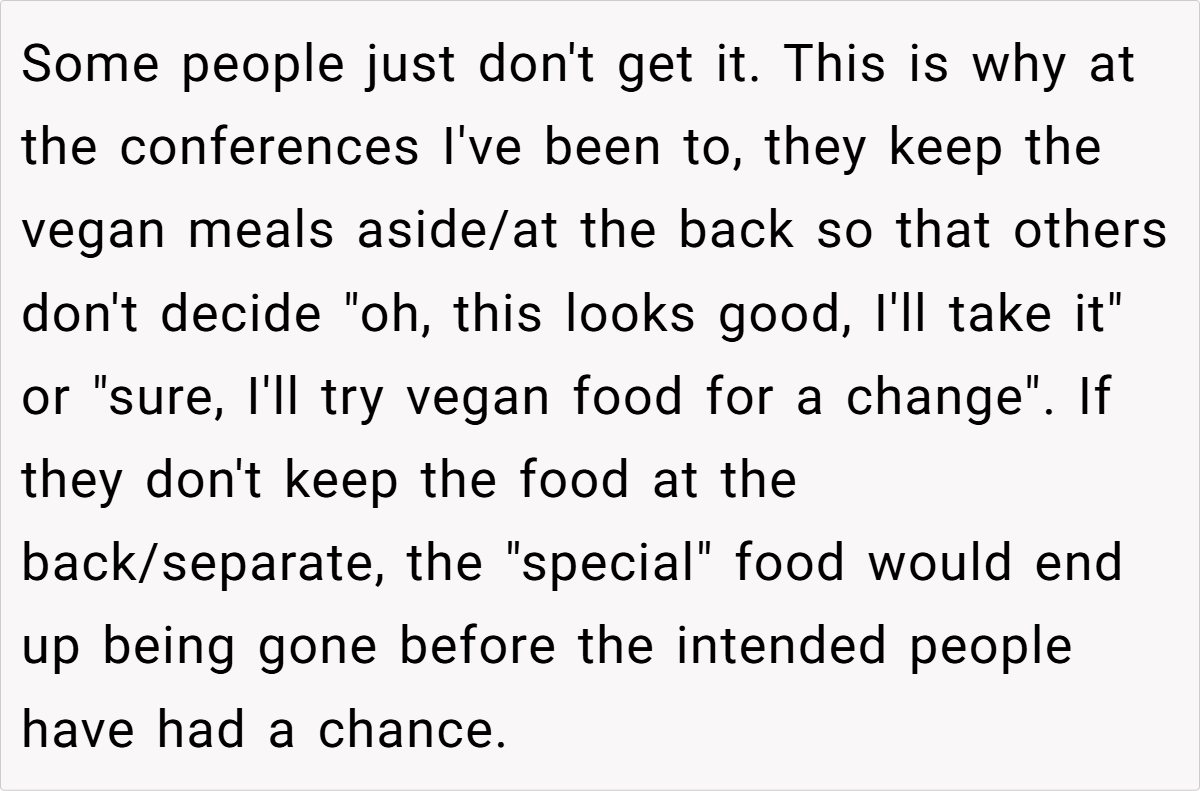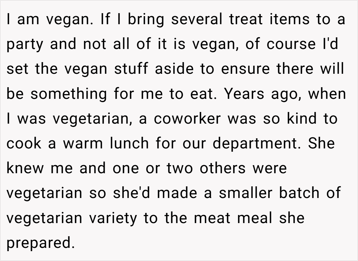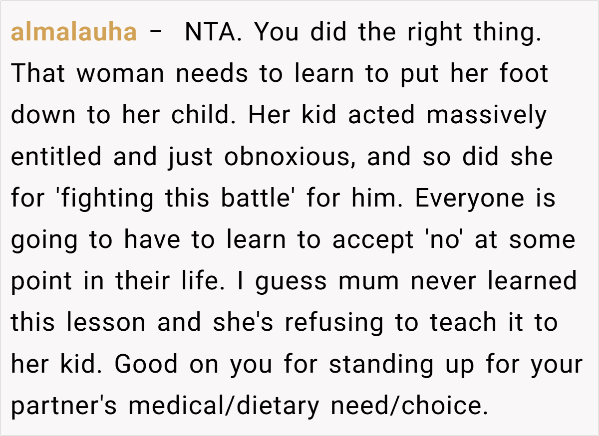 Redditors generally agreed that the OP’s actions were justified, pointing to a broader issue of entitlement and the importance of clear communication at social gatherings. Many highlighted that protecting one’s dietary needs should be a non-negotiable matter and noted that setting boundaries from the start might help avoid such conflicts. While humor and frustration intermingled in the responses, the consensus remained that respecting personal choices—however minor the issue—remains essential.