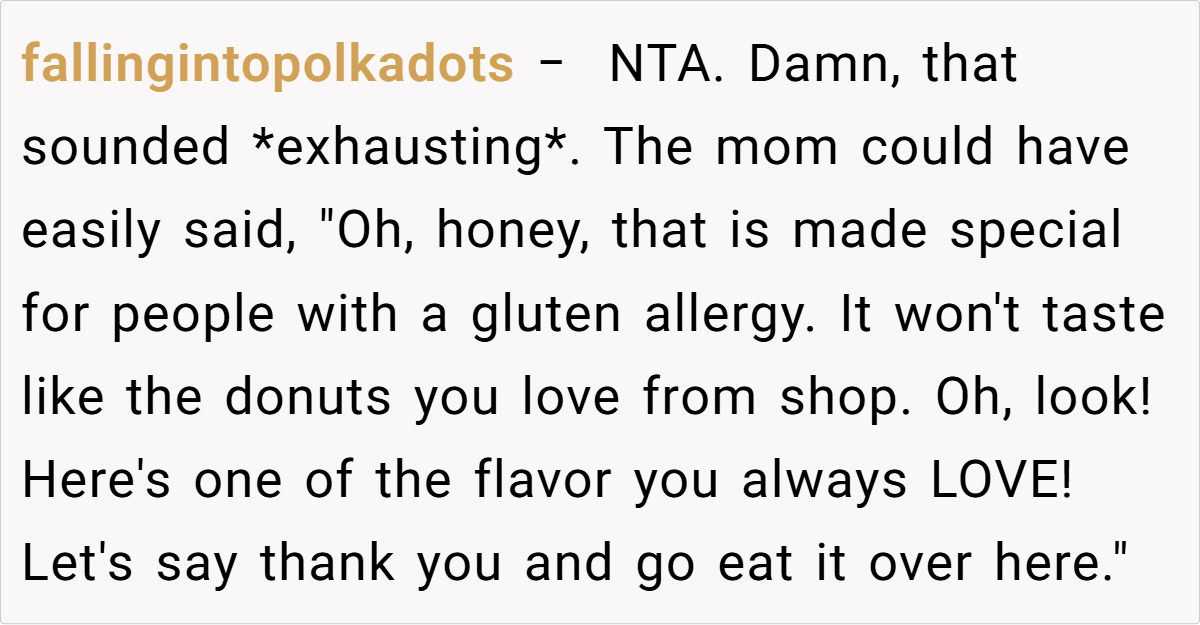 As relationship expert Brené Brown once said, “Daring to set boundaries is about having the courage to love ourselves even when we risk disappointing others.” This insight resonates here: the OP’s firm stance on preserving the gluten-free donut is a testament to prioritizing self-respect and the well-being of loved ones. Her actions remind us that healthy relationships—whether personal or social—thrive on the courage to assert our needs clearly and kindly.