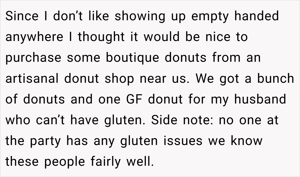 Letting your partner’s dietary needs be acknowledged in a social setting can sometimes be a surprisingly challenging ordeal. In this case, what began as a kind gesture—a well-thought-out selection of boutique donuts including one gluten-free option—quickly escalated into a dispute. This incident highlights how minor details, like reserving a special treat, can unexpectedly ignite conflict when social boundaries are blurred.