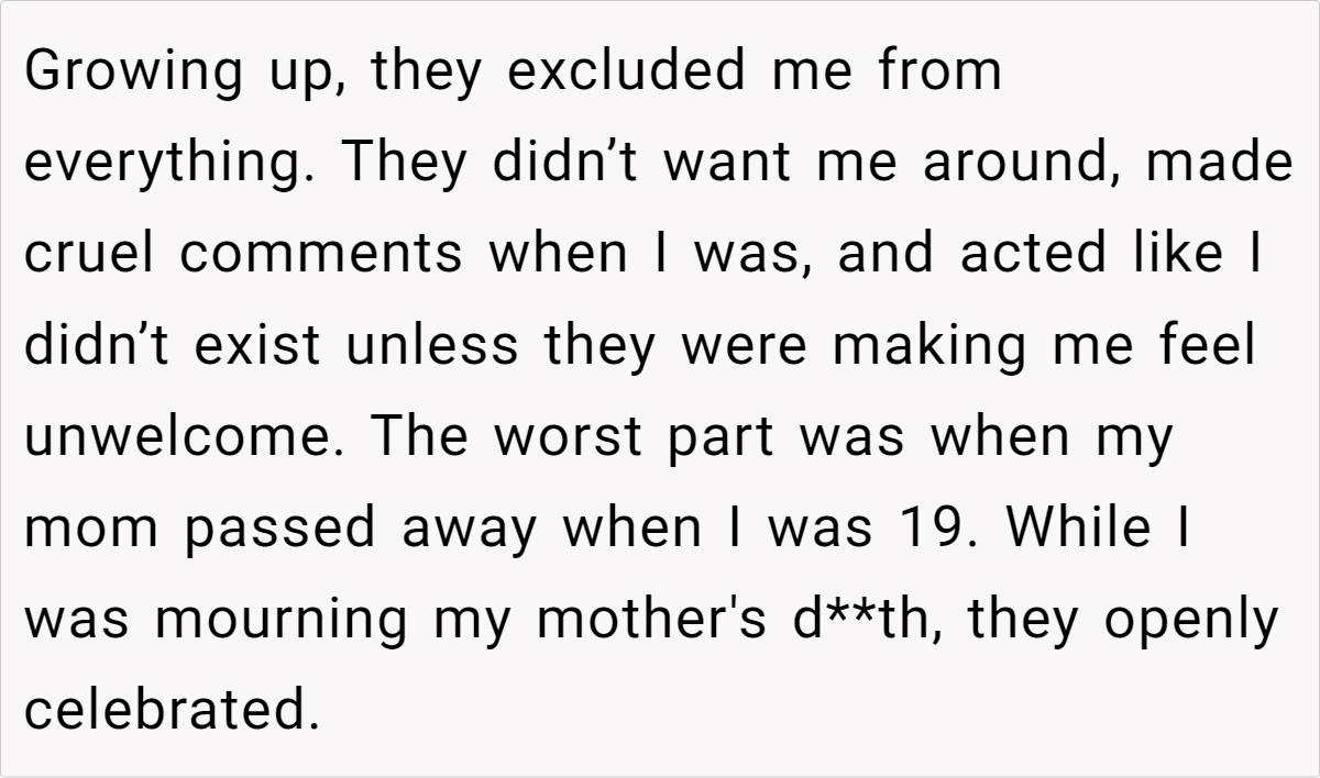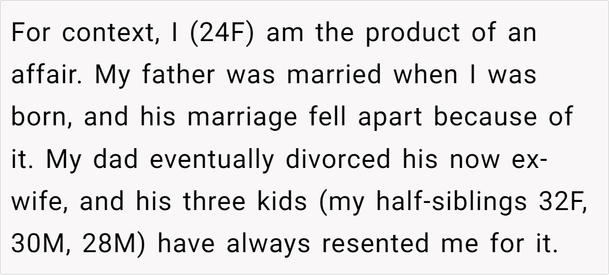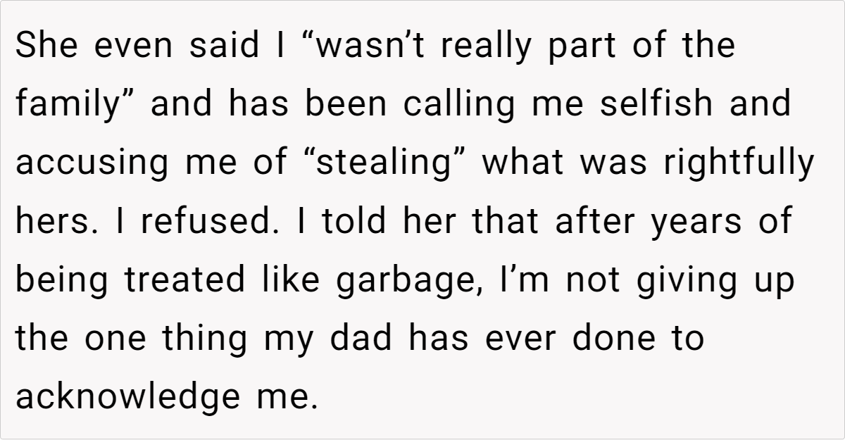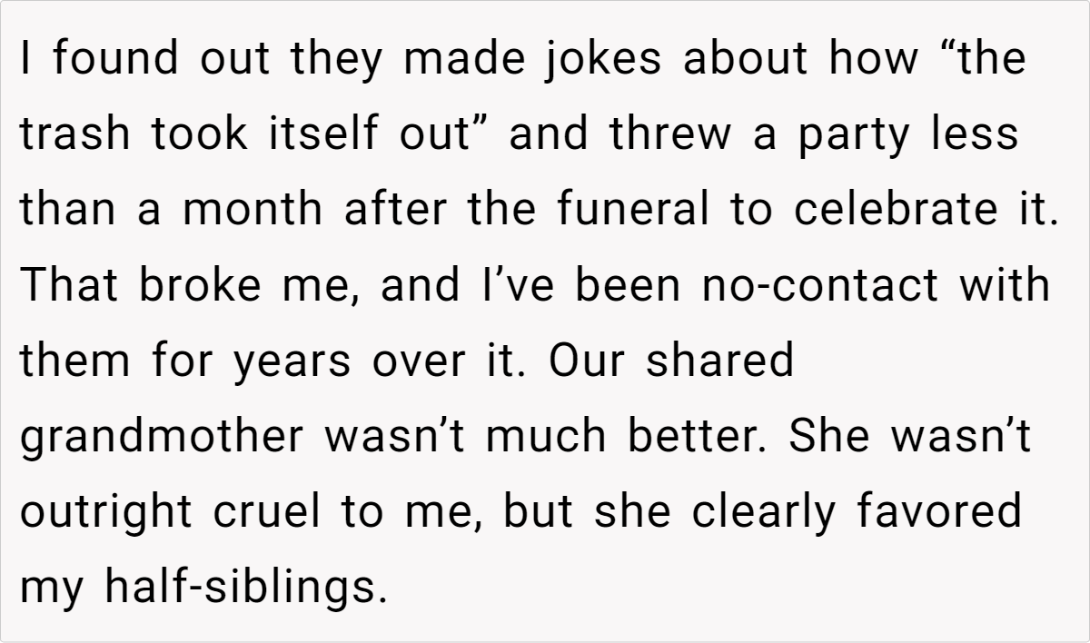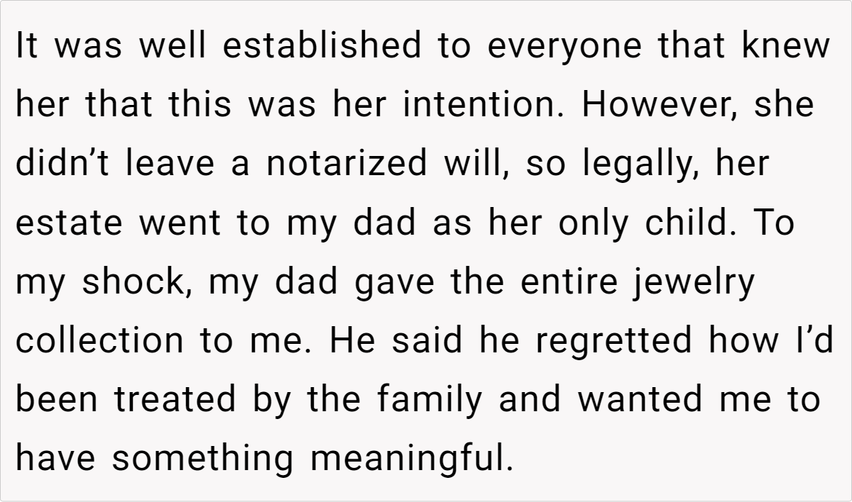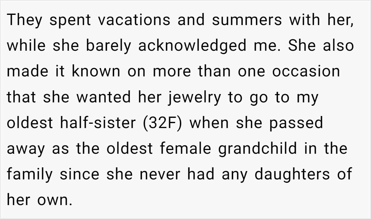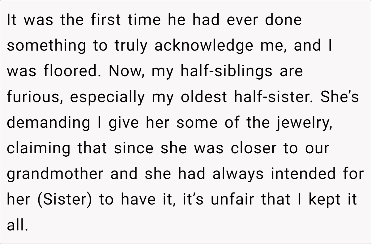 A Redditor shared their story of a complicated family dynamic, where they were excluded for years by their half-siblings due to being the product of an affair. When their grandmother’s jewelry collection was left to them, it sparked a conflict with their estranged siblings, who claim the jewelry was meant for the eldest granddaughter. Read the full story below to see how the drama unfolded!