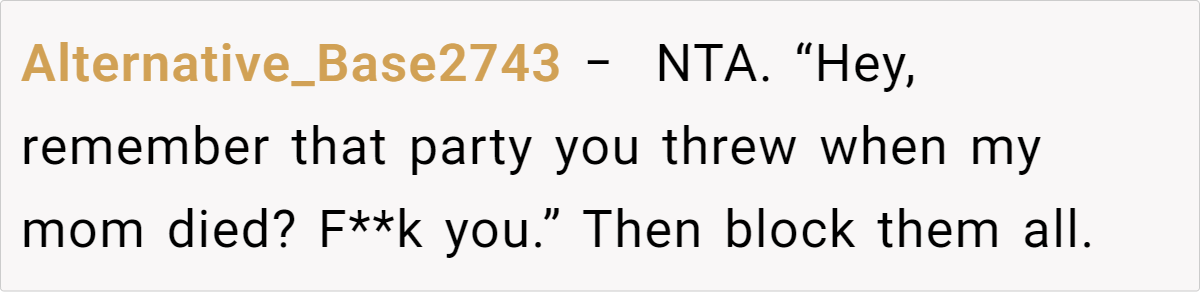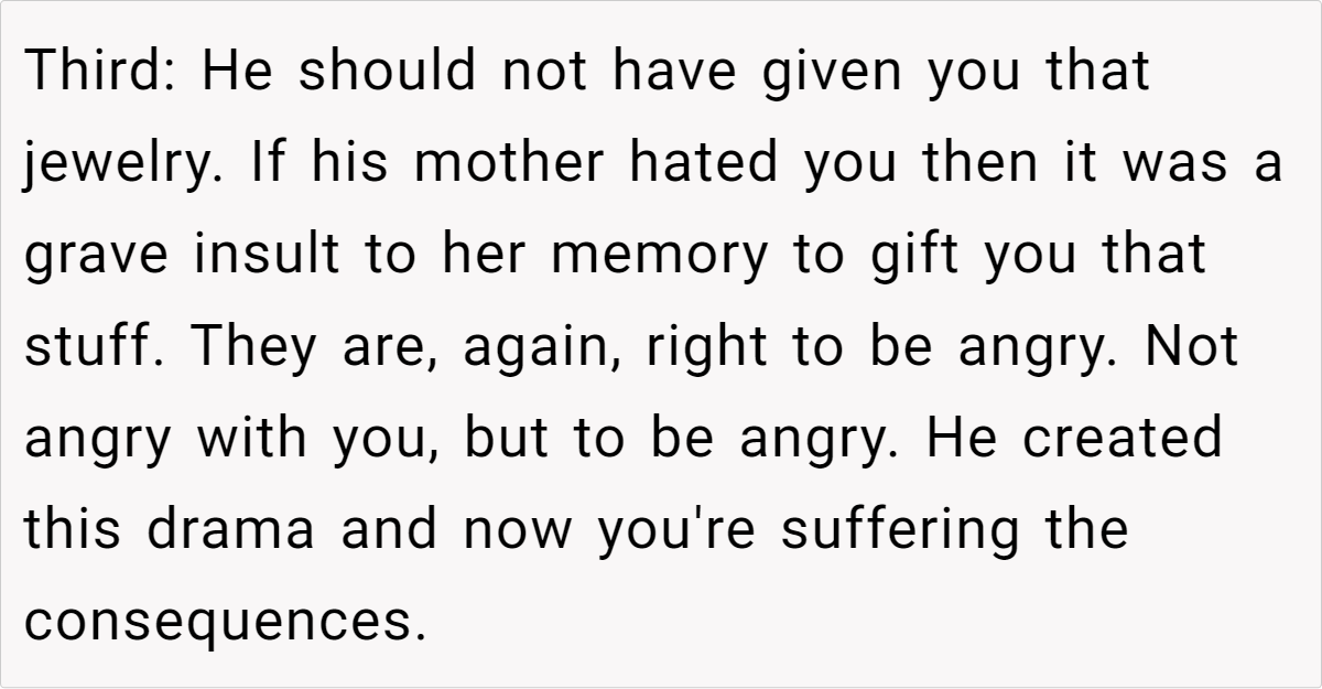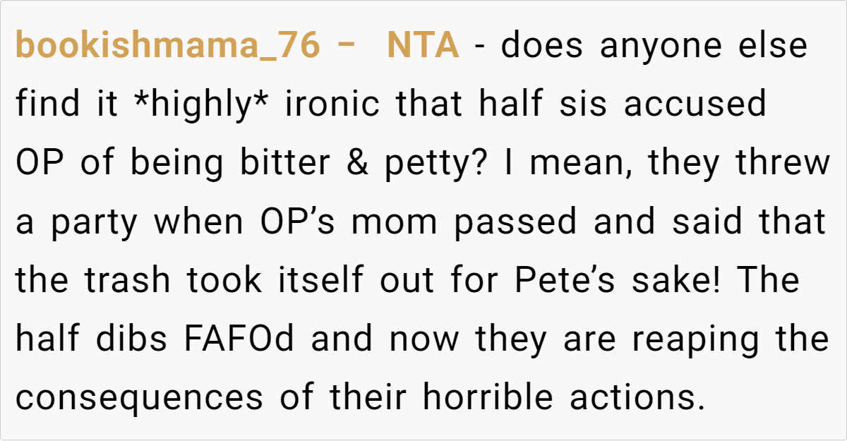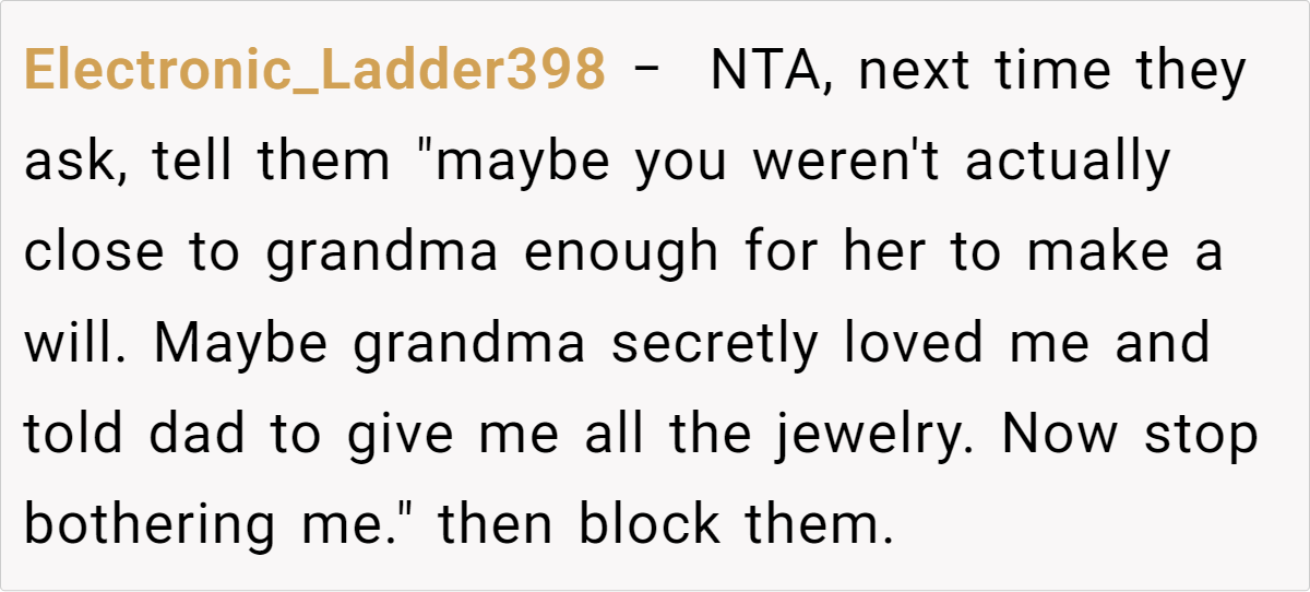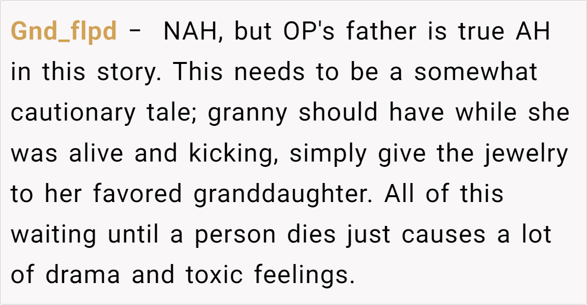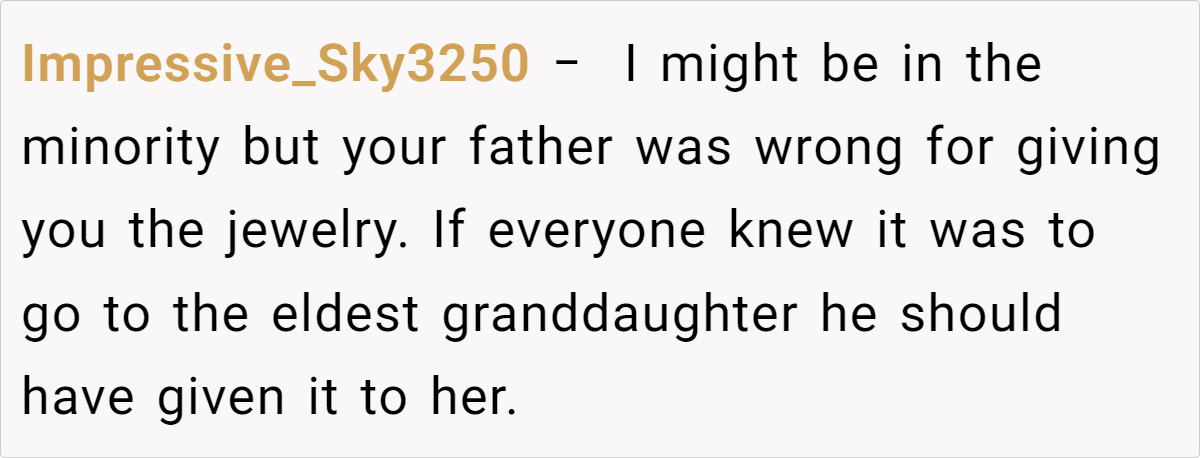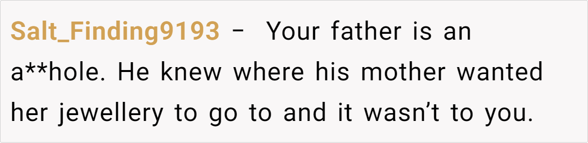 Reddit’s top comments overwhelmingly support the OP: “NTA. They celebrated your mom’s death—keep the jewelry!” Users skewer the father’s role, calling him the “true AH” for perpetuating family dysfunction. Some, like u/Electronic_Ladder398, advise sarcastic retorts, while u/bookishmama_76 highlights the irony of the half-sister’s accusations. A minority, like u/Impressive-Sky3250, criticize the father for disregarding his mother’s wishes.