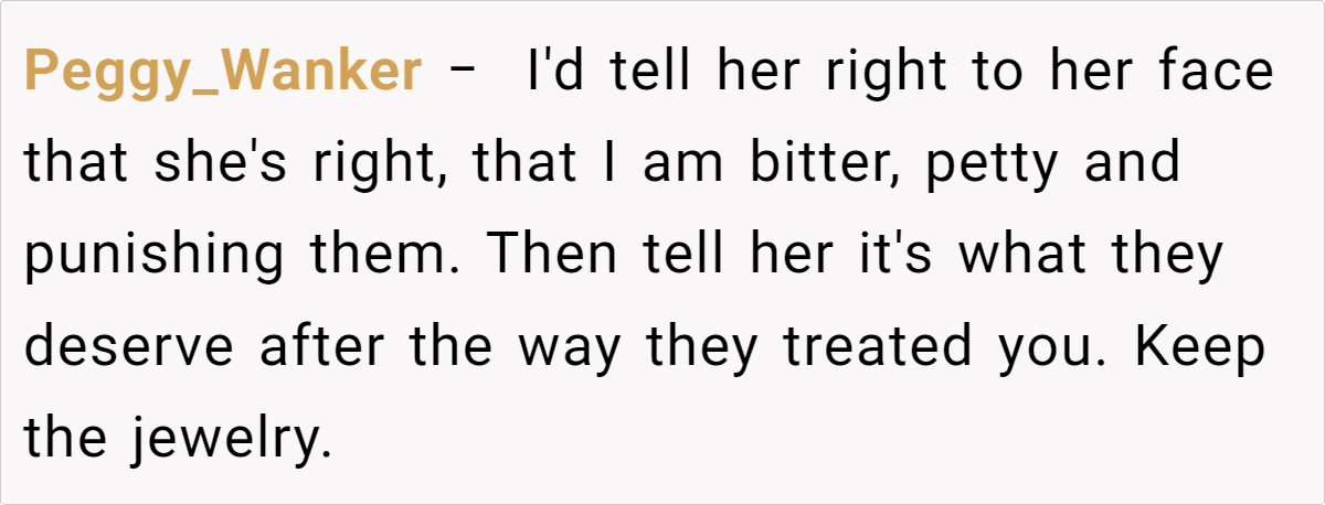Therapists like Dr. Sheri McGregor, author of Done With The Crying, advise setting boundaries: “Prioritize self-protection over reconciliation.” For the OP, retaining the jewelry may symbolize reclaiming agency. Yet experts caution against viewing possessions as reparations—“Heirlooms can’t replace love, but they can affirm worth,” says Dr. Coleman.