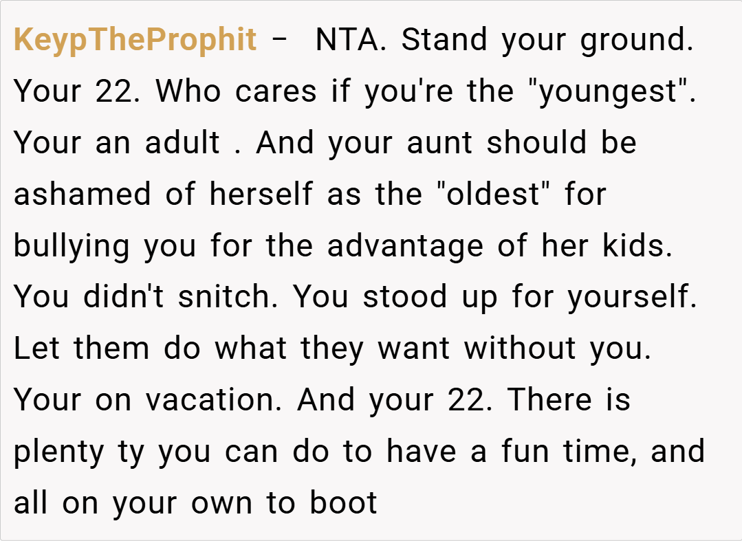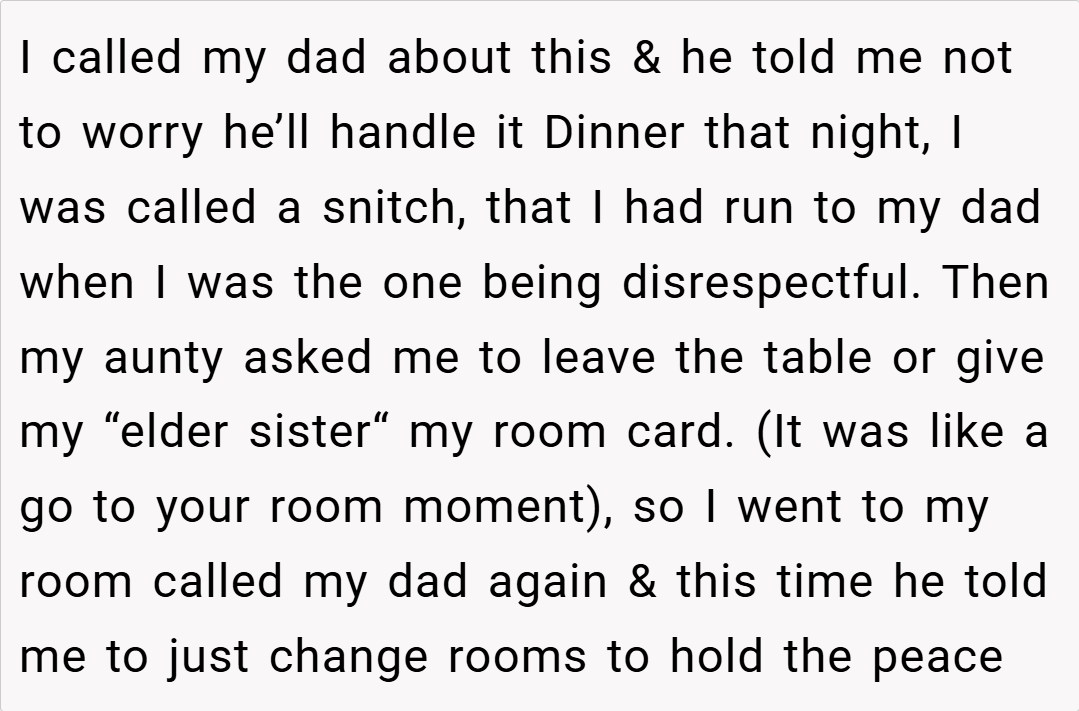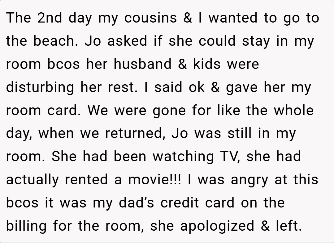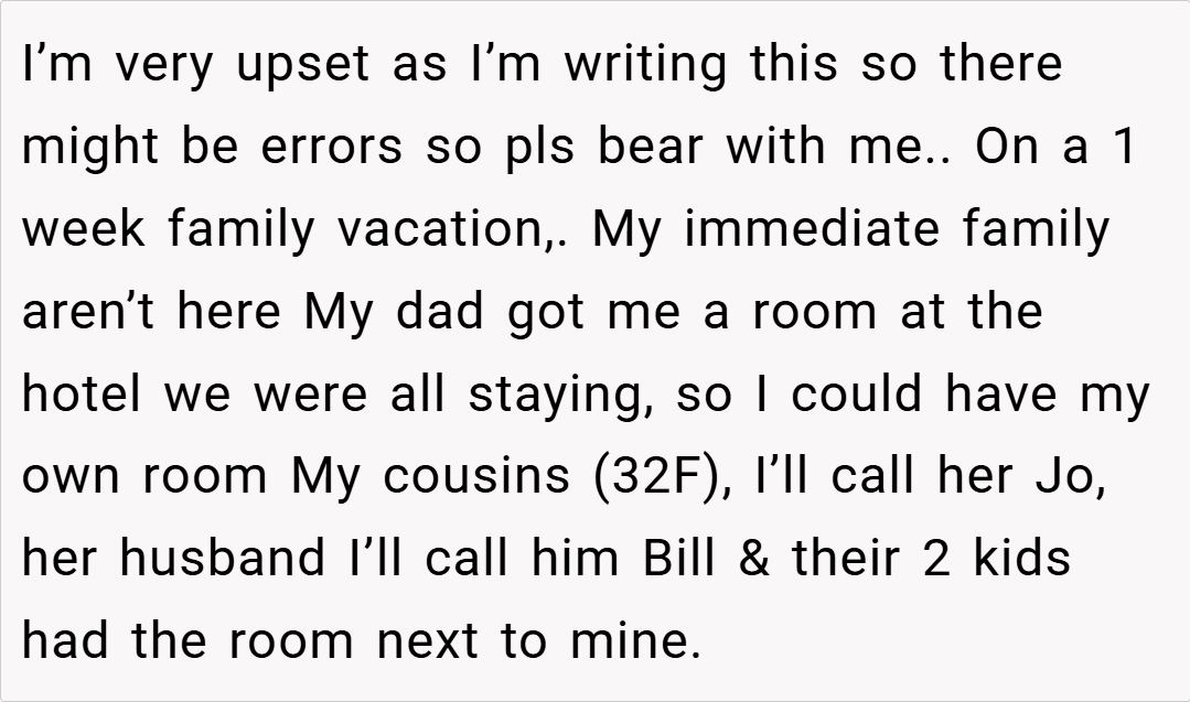 During what was supposed to be a relaxing family vacation, one 22-year-old found herself caught in a tug-of-war over a hotel room that was meant exclusively for her. With her father having booked a separate room for her, the expectation was that she could enjoy some privacy during the trip. However, things quickly took a turn when her cousin, along with her husband and kids,