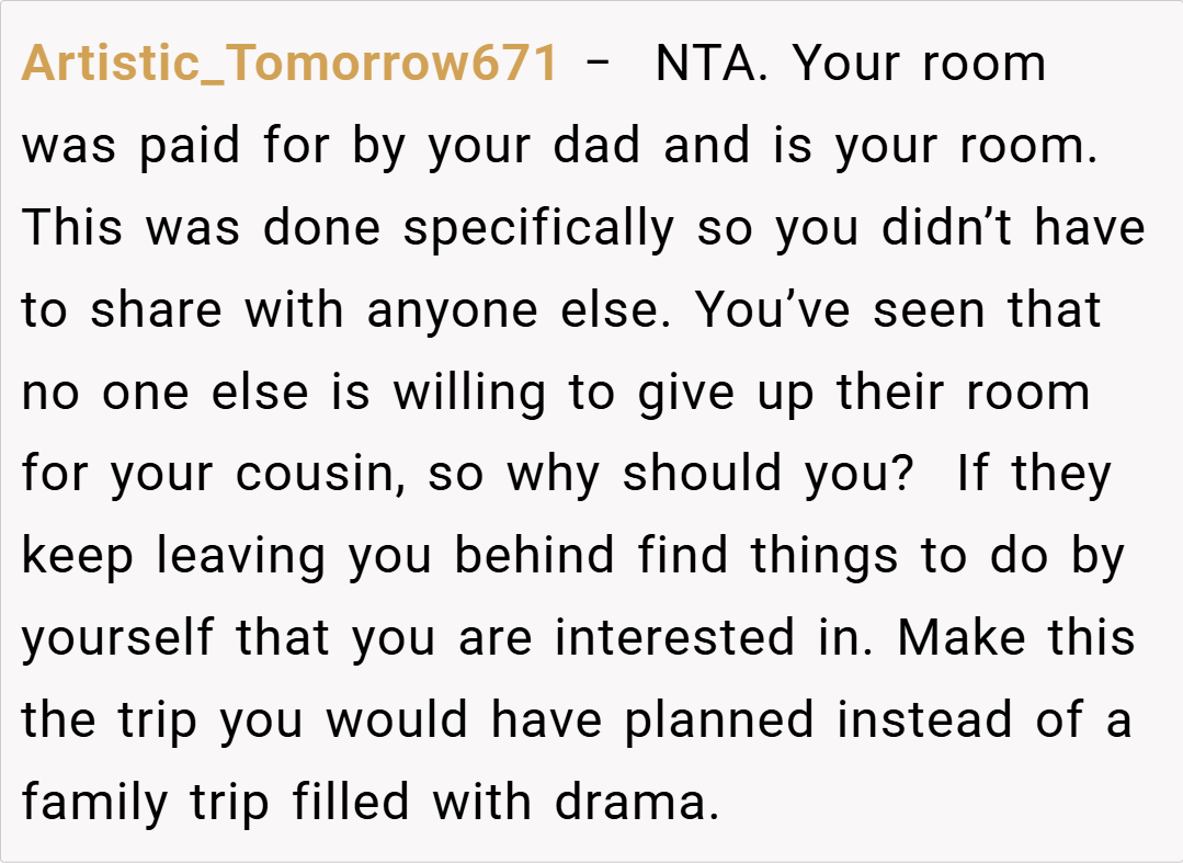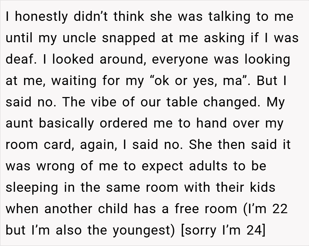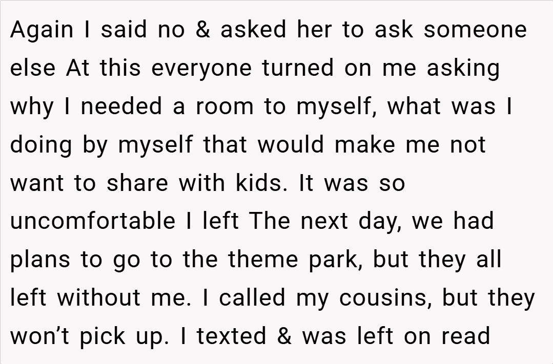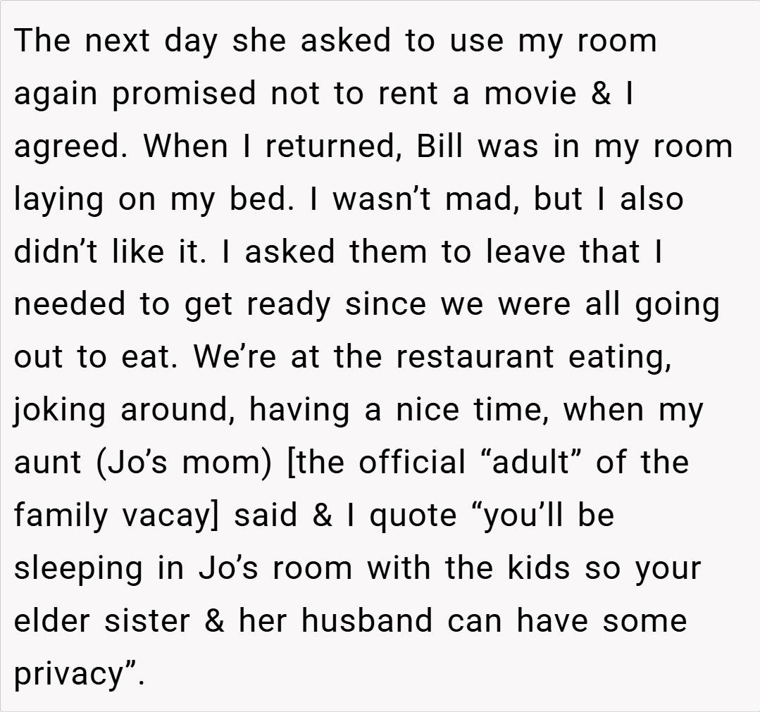 began making repeated requests to use her room—first for a brief respite, then for an entire day, and eventually culminating in an attempt by her cousin’s husband to relax on her bed. The situation escalated when an authoritative family member demanded that she give up her room so that other relatives could enjoy more “privacy,” leaving her feeling bullied and disrespected.