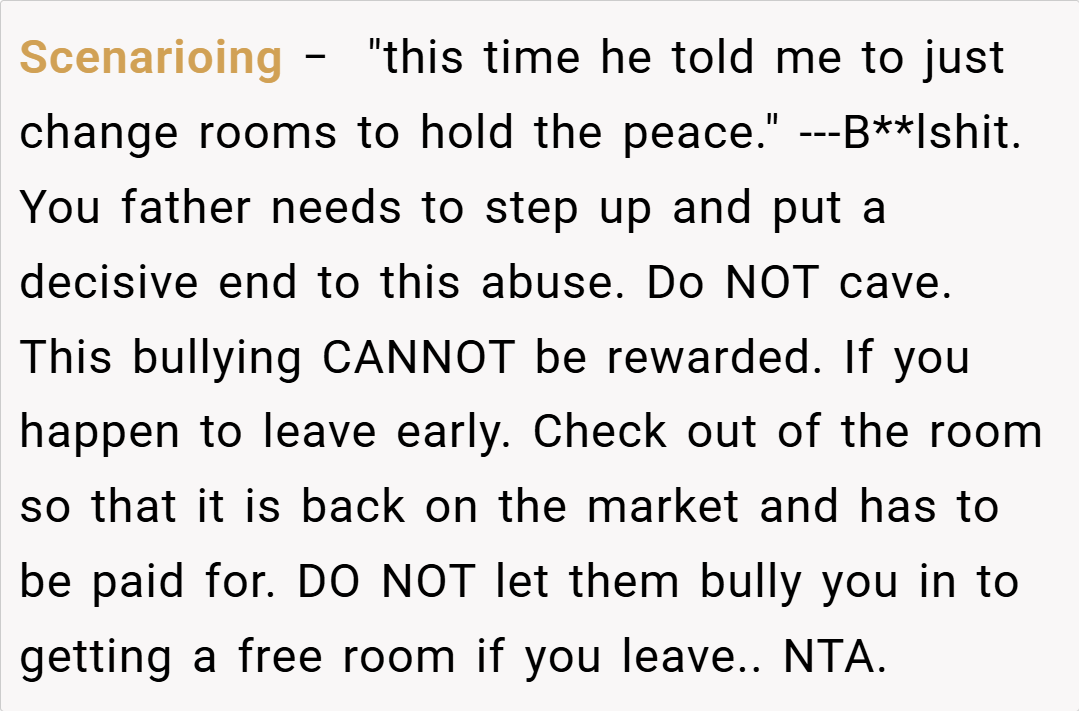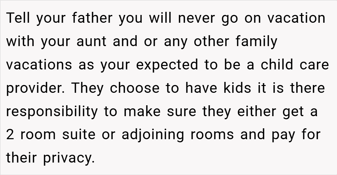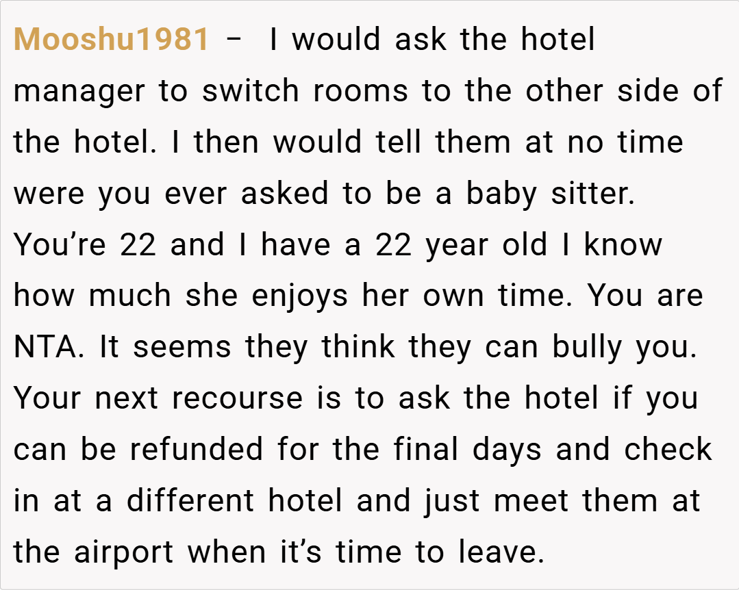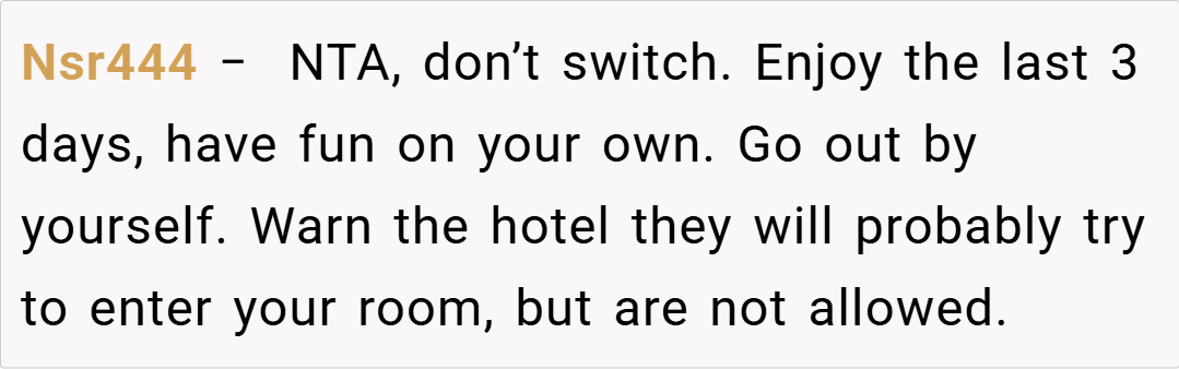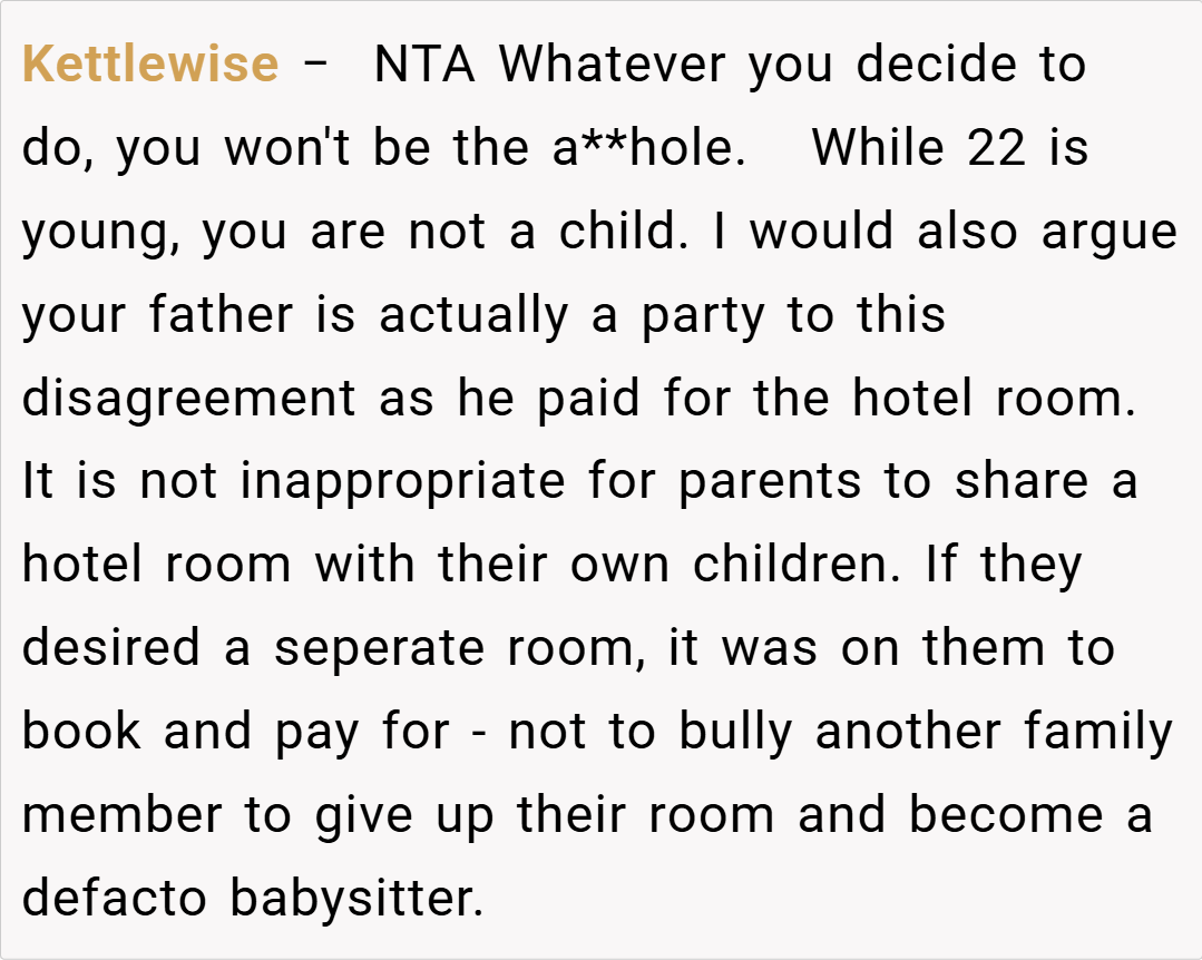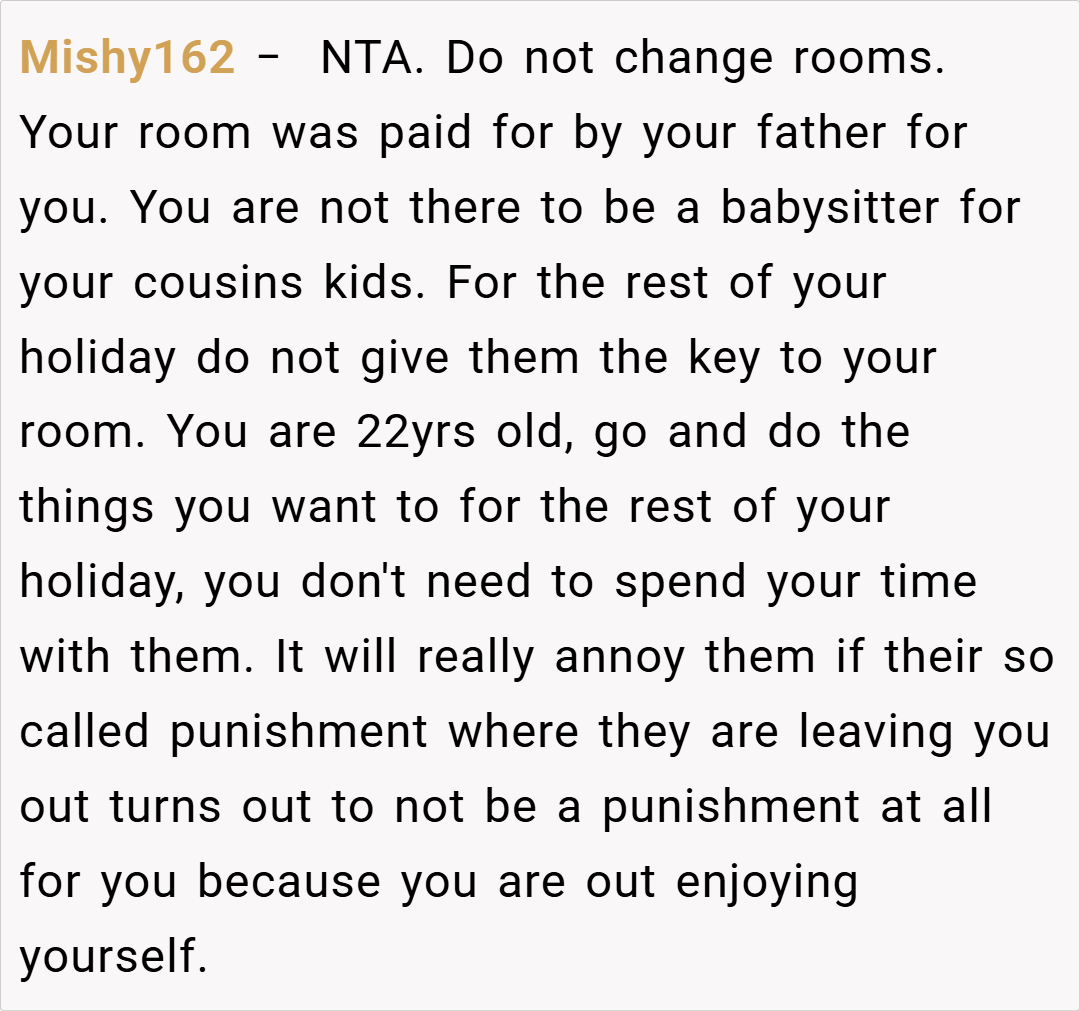 The incident not only disrupted her vacation but also exposed underlying family dynamics where adult responsibilities and personal boundaries are blurred. Her refusal to relinquish a room that was clearly designated for her—paid for by her father—became a stand against being forced into an impromptu babysitting role, a role she never signed up for.