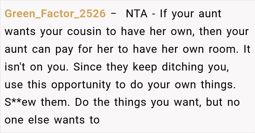 The Reddit community was quick to rally behind the young woman, with many users emphatically stating that the room was hers to enjoy, not a communal asset to be exploited. Comments pointed out that if her aunt or cousin needed extra space or childcare, they should have planned for it or paid for a separate room.