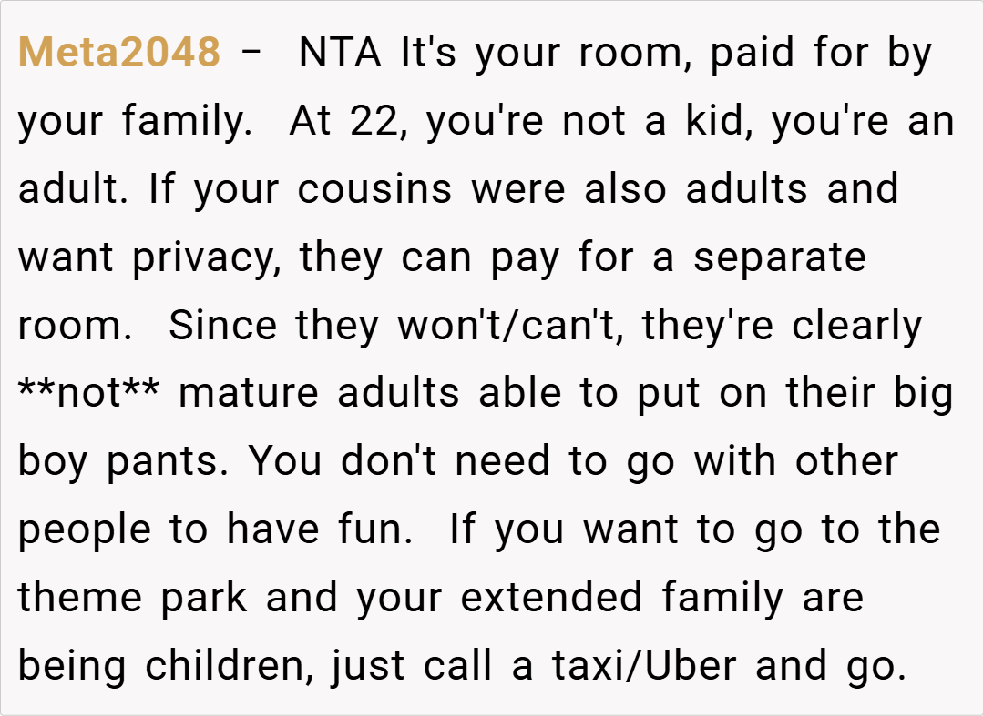 The young woman’s stand against her relatives’ demands is not just about a hotel room—it’s a call for acknowledging and respecting adult autonomy. What do you think: should family obligations ever override personal space, or must everyone honor clear financial and personal boundaries? Share your thoughts and experiences in the comments below!