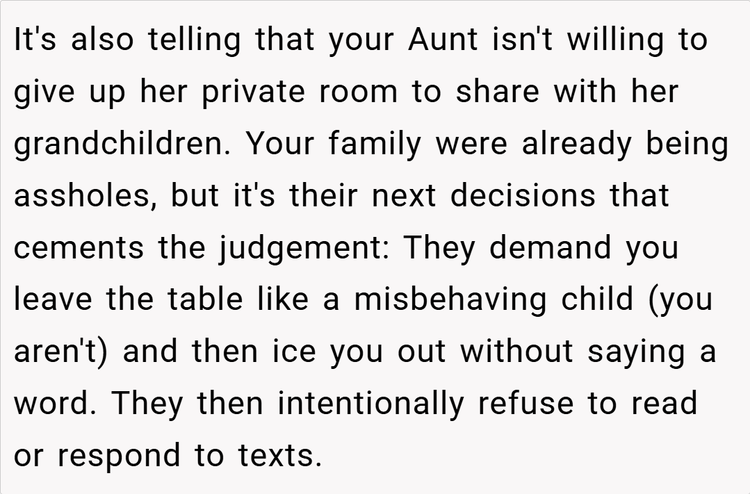 Parenting and family dynamics specialist Dr. Laura Markham advises, “Respecting personal boundaries is key to maintaining healthy relationships, and adults should model that behavior by honoring each person’s autonomy” (https://www.ahaparenting.com). In this case, the repeated requests for room-sharing—and the subsequent pressure from an older relative—highlight a significant lapse in respecting individual rights within the family.