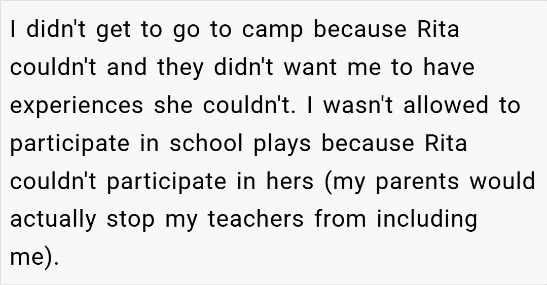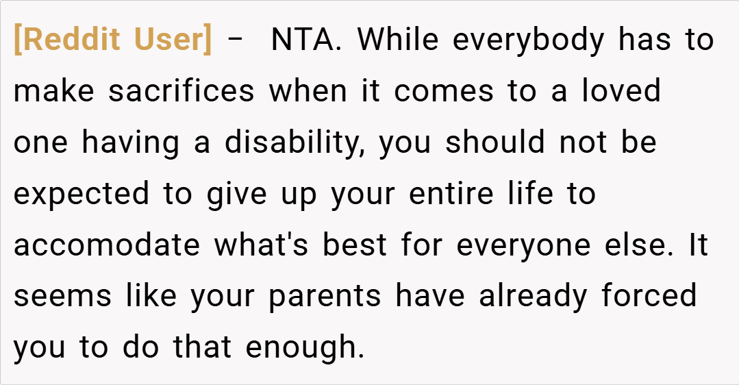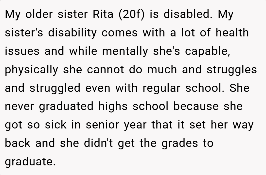 Navigating family dynamics when disability’s in the mix is like trying to solve a Rubik’s Cube blindfolded—it’s tricky, and someone’s bound to feel scrambled. The Redditor’s parents seem to think equality means holding everyone back, but that’s a logic loop even a sitcom dad would side-eye.