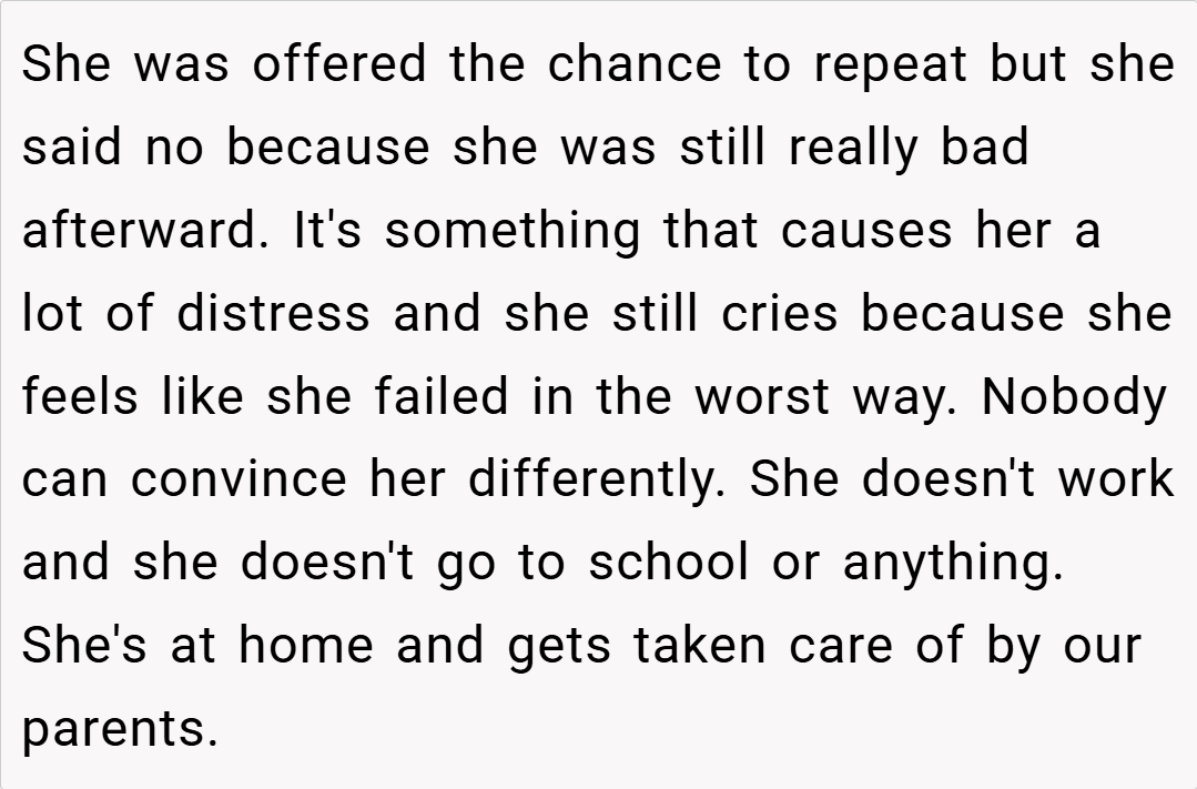 Rita’s struggles are real, no doubt—her distress over not graduating is a gut punch. But pinning the younger sister’s future to that pain? That’s where the script goes off the rails. Psychologist Dr. John Duffy, in an article from Psychology Today, nails it: “Parents sometimes overcompensate for one child’s challenges by limiting the other, but it’s a disservice to both.” Rita’s stuck in a pity spiral, and instead of helping her climb out—say, with therapy or adaptive programs—Mom and Dad are tossing their other kid into the pit too.