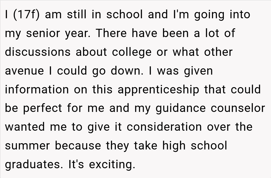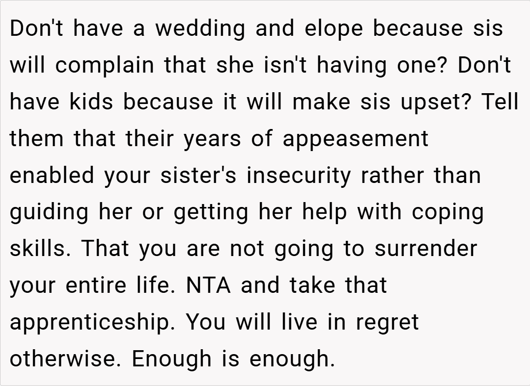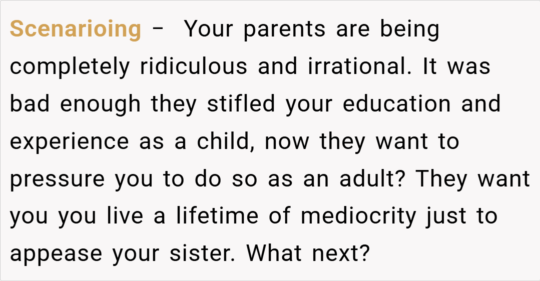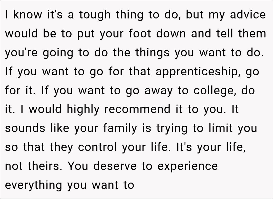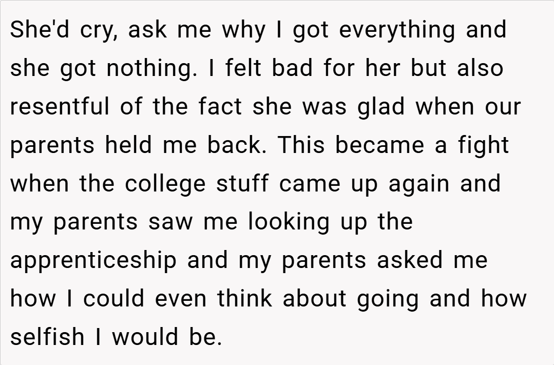 Whew, what a rollercoaster—sibling rivalry, parental pressure, and a dash of teenage rebellion all stirred into one messy pot. Our Redditor’s not just fighting for an apprenticeship; she’s clawing back her right to a life uncluttered by someone else’s what-ifs.