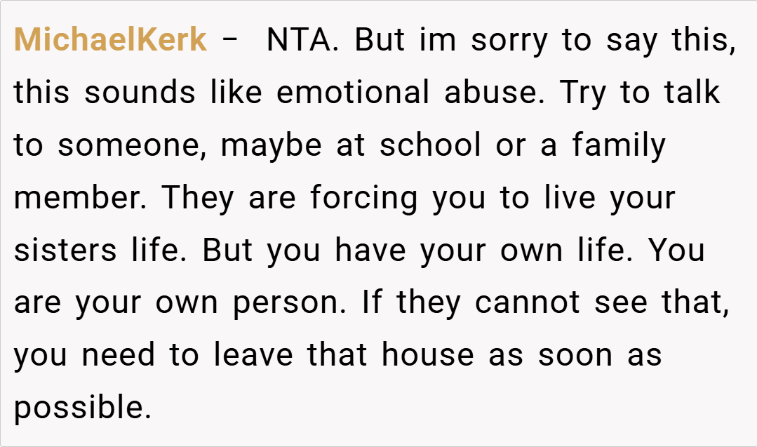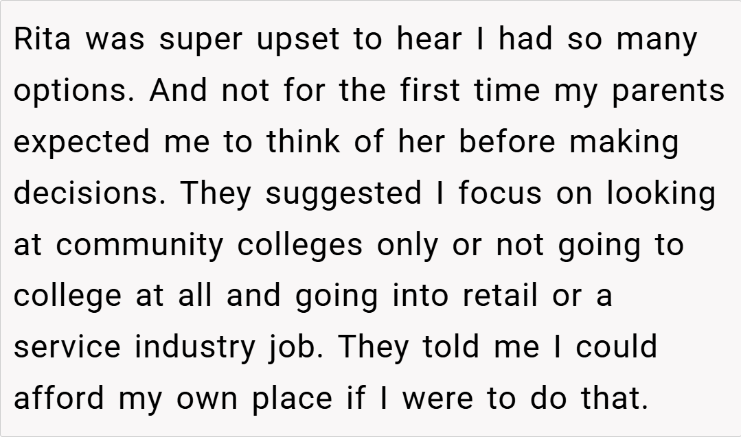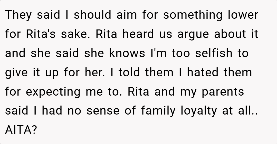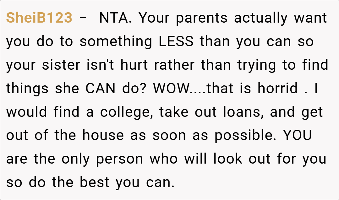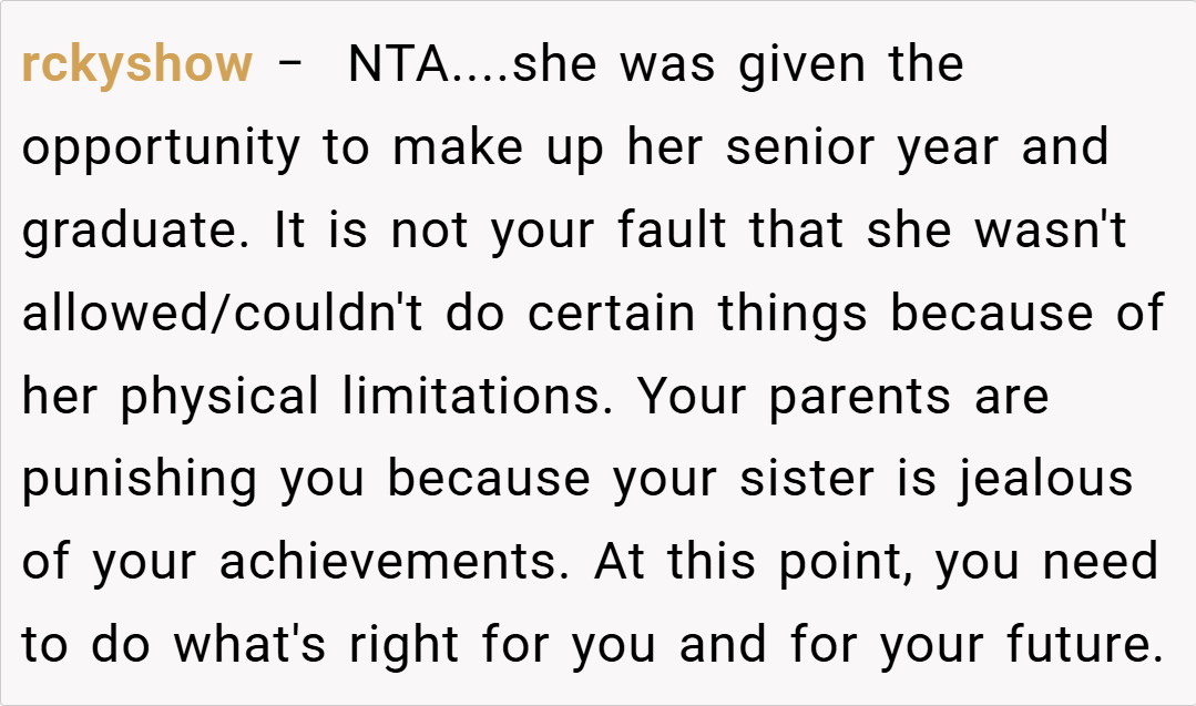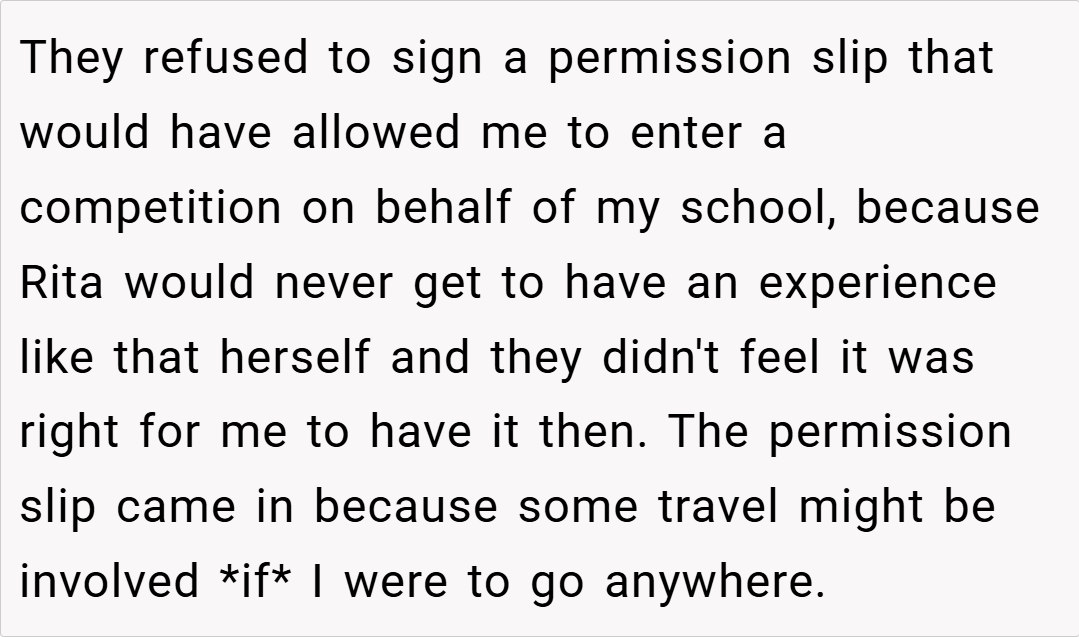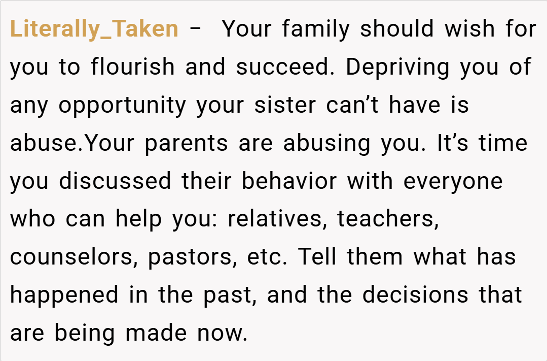 That’s the tightrope one Redditor’s been walking, caught between chasing her dreams and a family that insists she keeps her feet firmly on the ground—for her sister’s sake. Meet our protagonist, a high school senior with a sparkle in her eye and a resentment simmering in her heart.