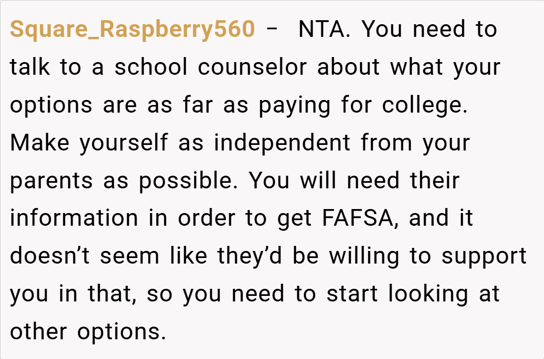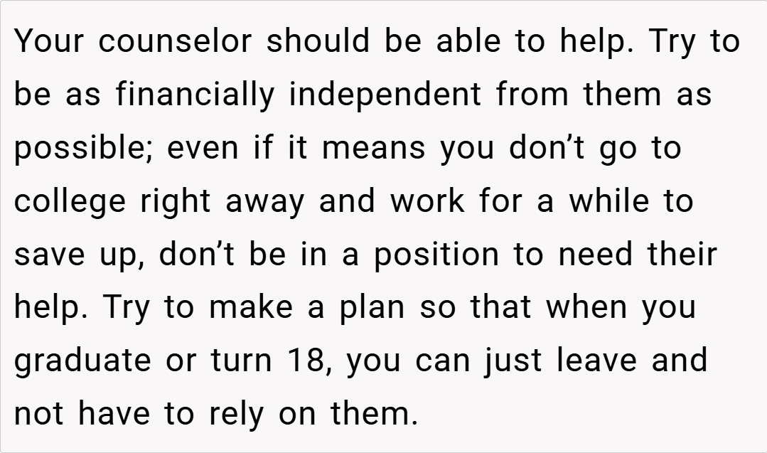 So, advice time: Redditor, grab that apprenticeship with both hands. Talk to your counselor about scholarships or loans (check out fafsa.gov for starters) and plot your escape hatch quietly—no need to wave the flag until you’re out the door. You’re not selfish; you’re surviving.