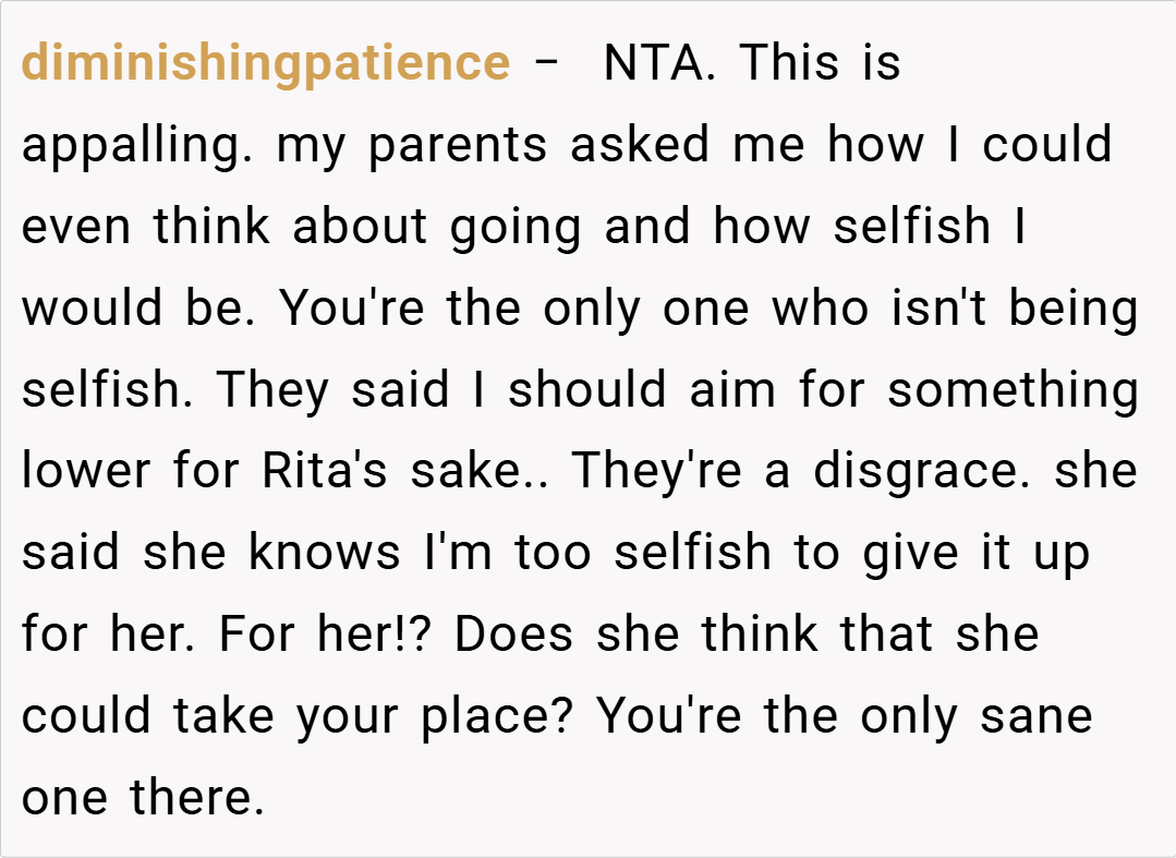 The Reddit crew didn’t hold back, and honestly, it’s a popcorn-worthy thread . From “this is emotional abuse” to “stop telling them your plans,” the consensus is loud: NTA—Not The Asshole. One user quipped, “What’s next, no wedding because Rita can’t have one?”—a jab so sharp it could cut through the family’s guilt trips. These hot takes are candid, hilarious, and oddly therapeutic, but do they mirror real life? Maybe it’s time to test the waters ourselves.