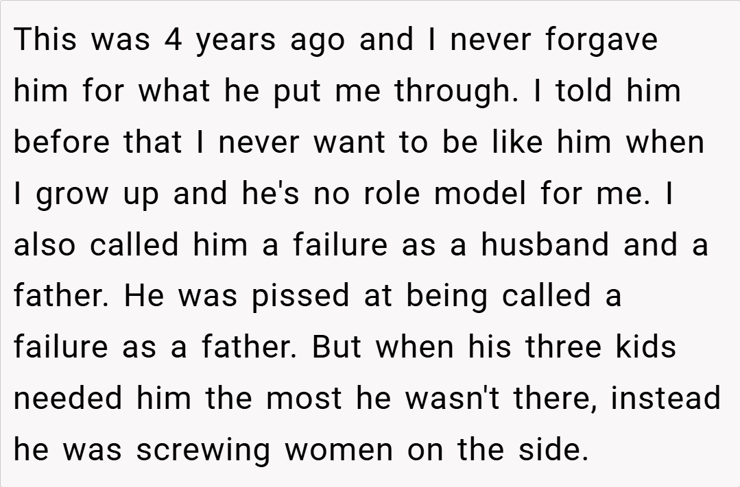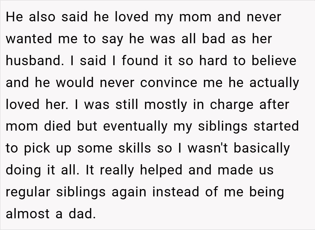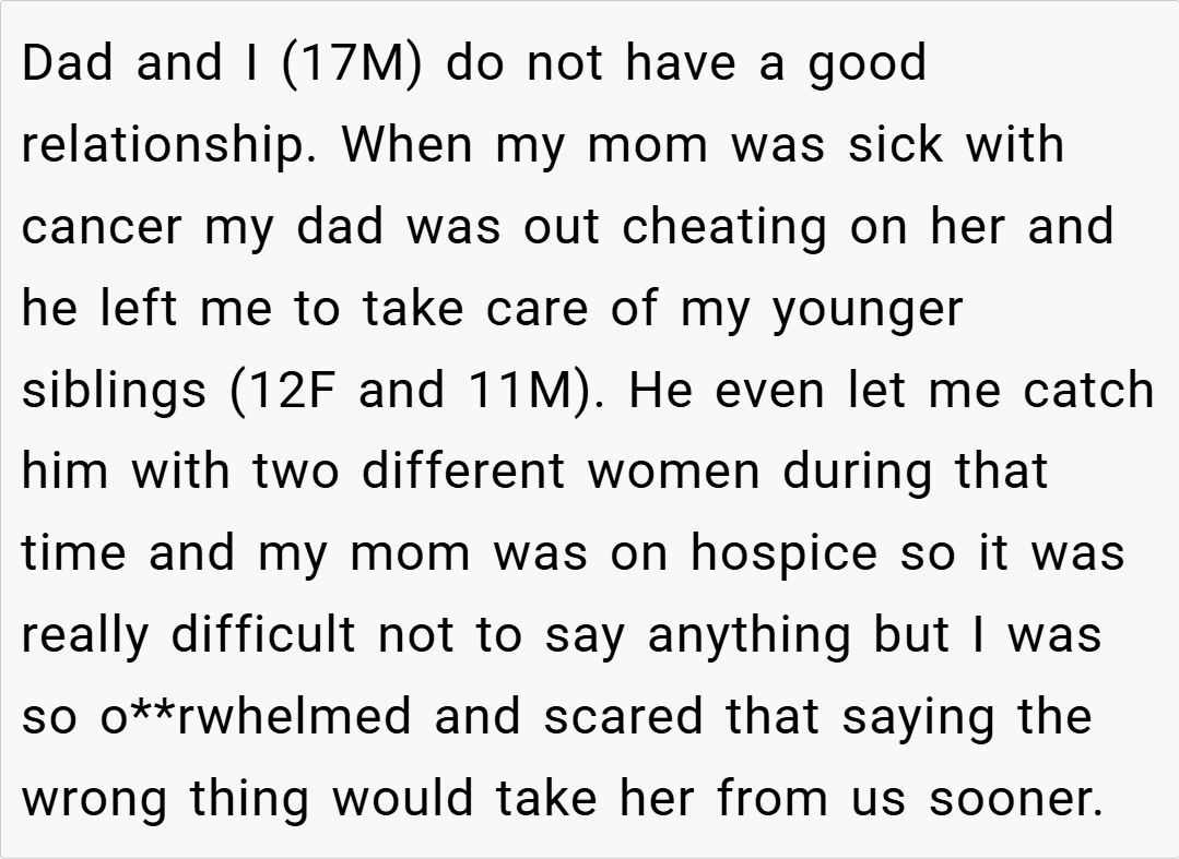 Family dynamics can be messy, especially when past hurts and unmet responsibilities pile up over the years. In this raw, unfiltered account, a 17‑year‑old shares his painful history of being forced into a parental role after his mom fell ill and passed away—while his dad repeatedly chose his own interests over family duty.