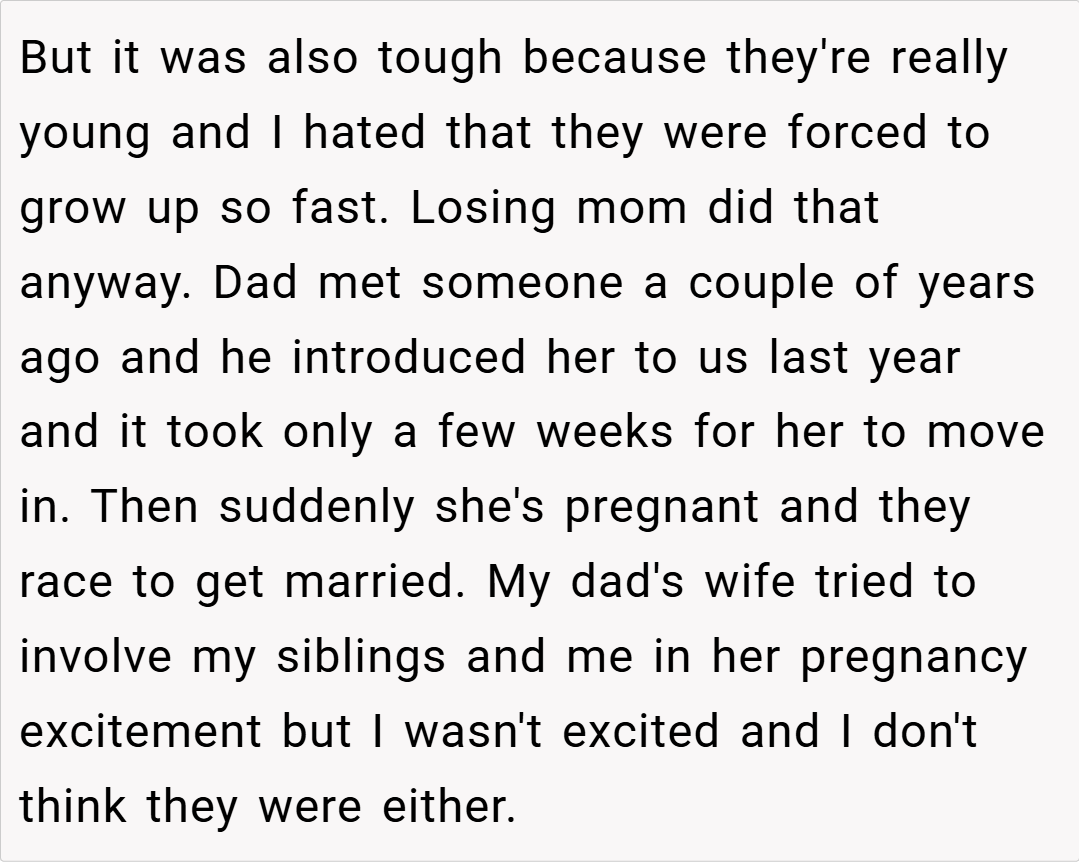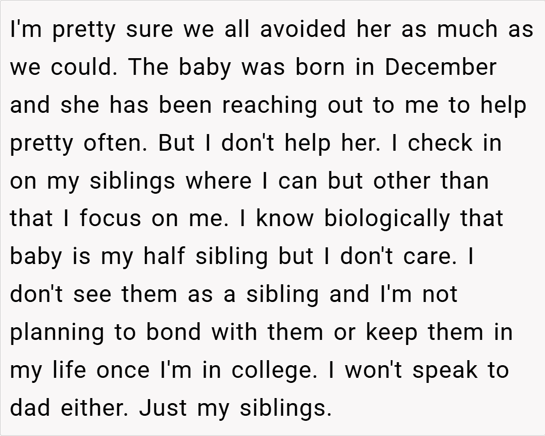 Another critical aspect is the question of responsibility. The teen points out that he was never consulted about his father’s decisions—both in the past and with this new family arrangement. Instead, he was left to manage on his own during some of the toughest moments in his life. “It’s not my job to help her or her baby,” he states firmly, emphasizing that the duty of care should fall to his dad, who failed him when he needed support.