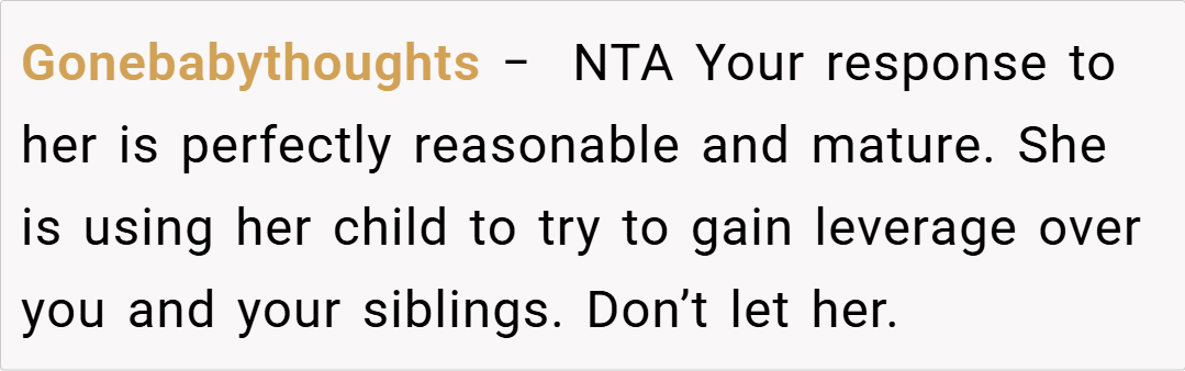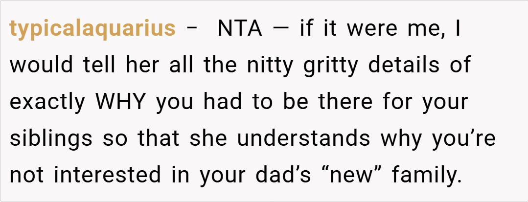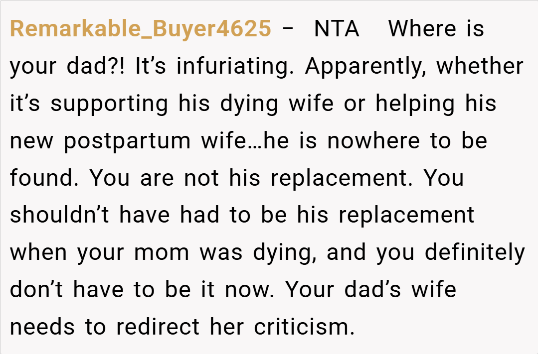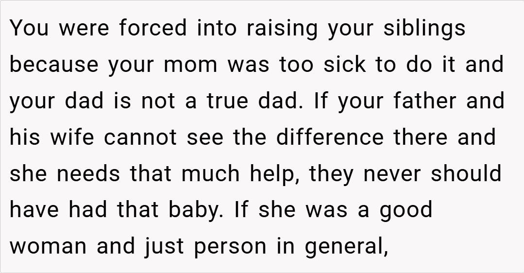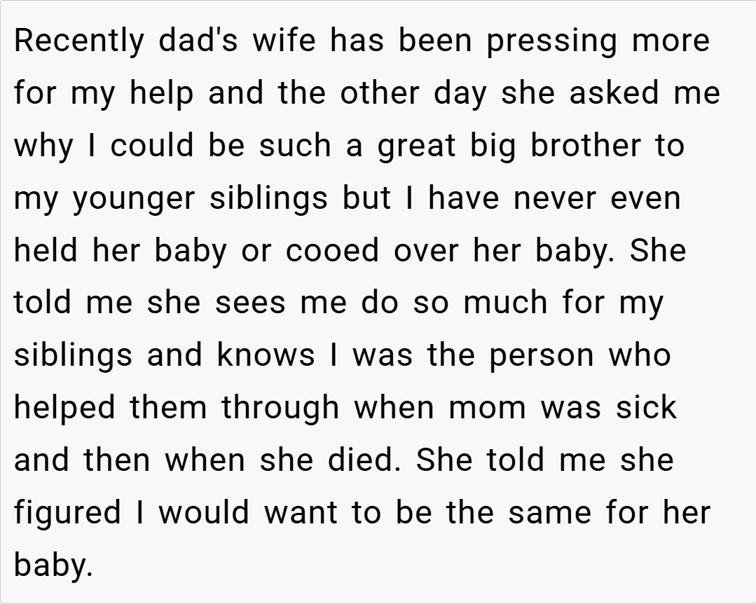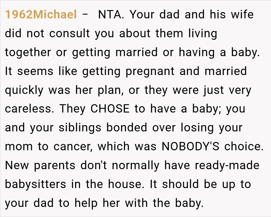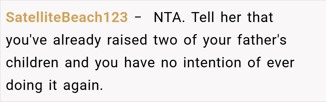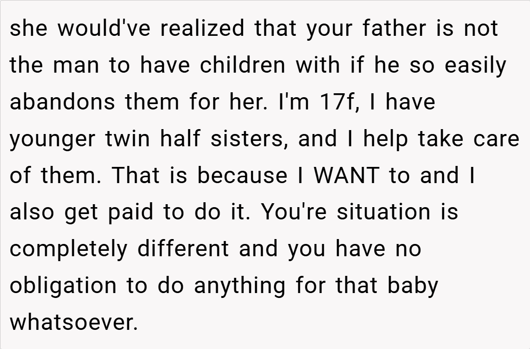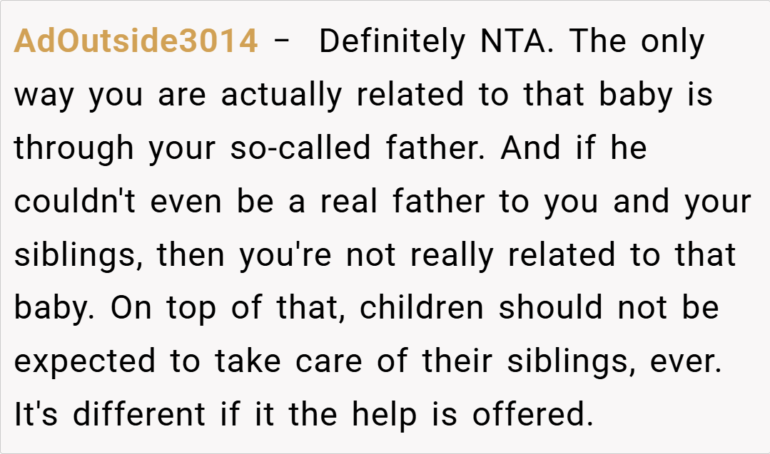 Redditors overwhelmingly support his decision, noting that no one should be expected to serve as a surrogate parent for a new family member when past betrayals and neglect have already taken their toll. Many agree that his refusal is a necessary step toward protecting his emotional health.