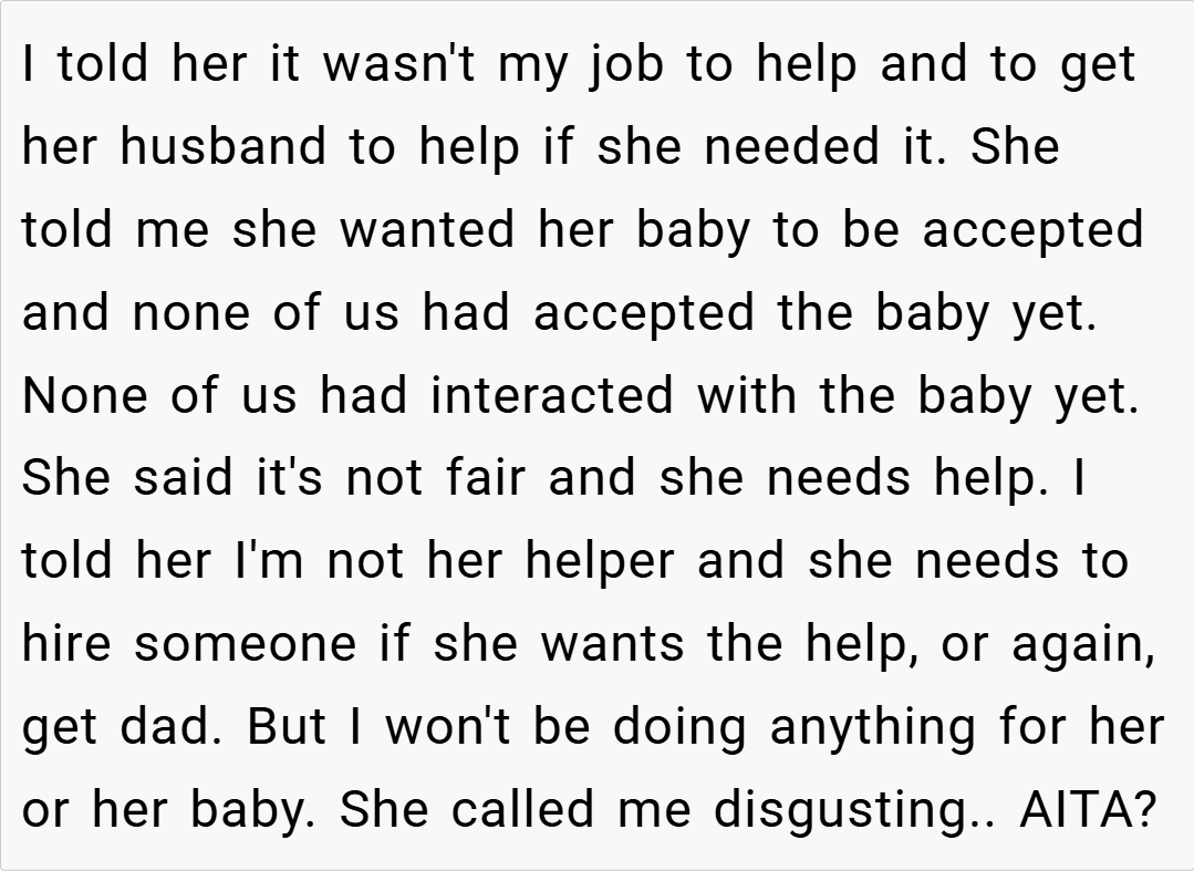 ‘AITA for refusing to help my dad’s wife with their baby and saying I am not her helper?’