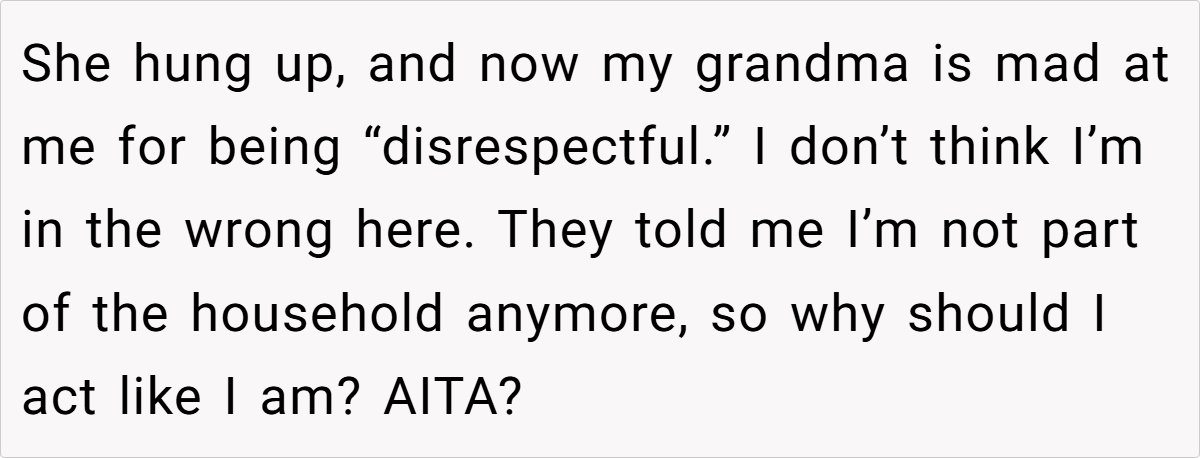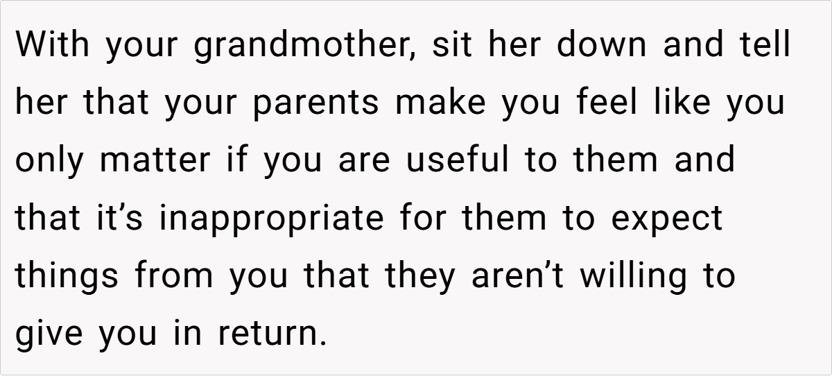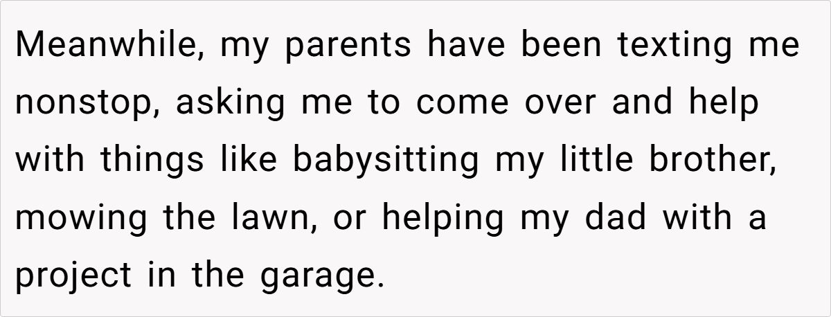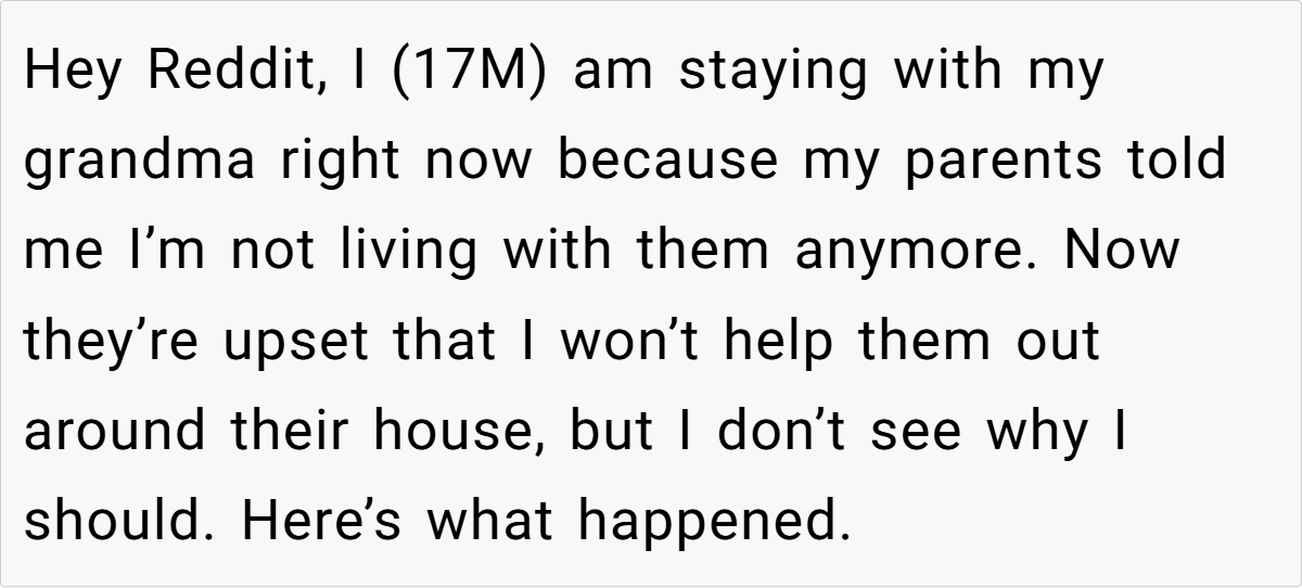 Now, his parents are acting like nothing happened—except when they need help. They’re calling, texting, and demanding he come over to do chores. OP refused, pointing out that if he’s not part of the household anymore, he shouldn’t have to act like he is. But his grandma thinks he should apologize and “keep the peace.”