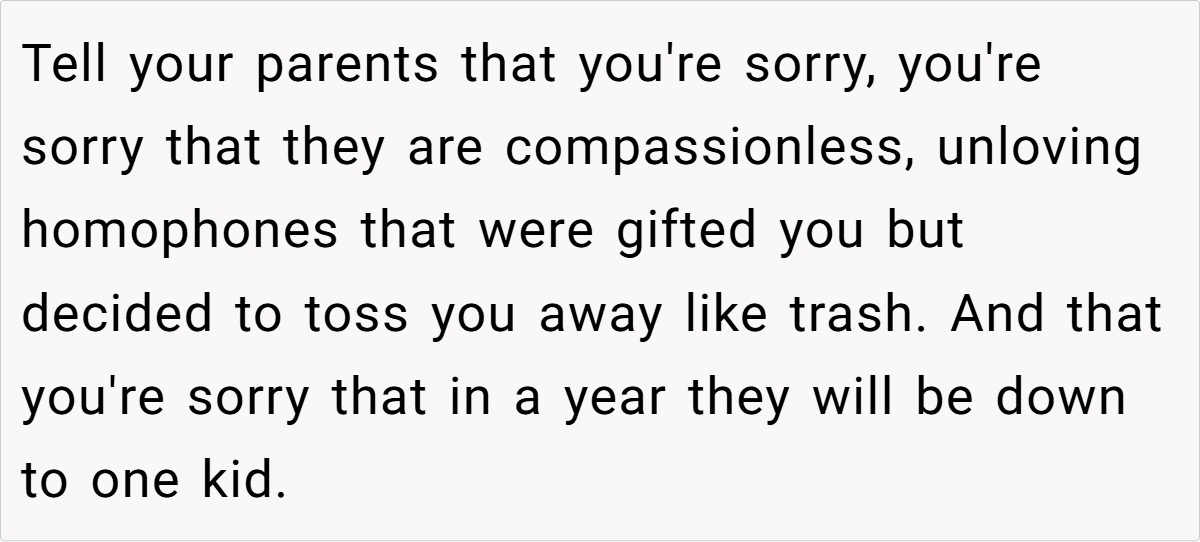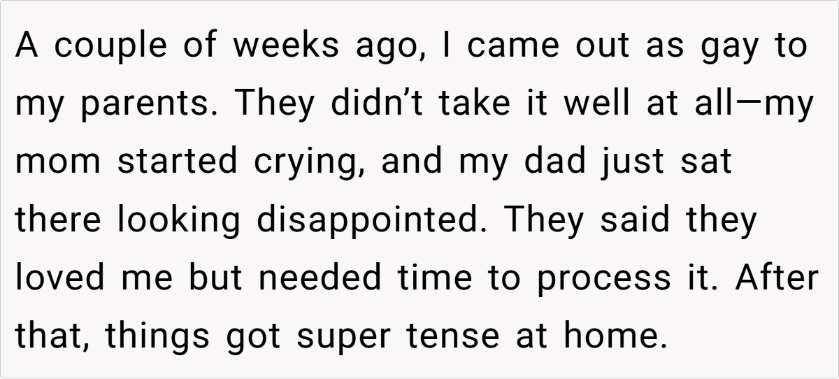 Family should be about love and support—but for OP (17M), coming out as gay turned his home into a battleground. His parents didn’t take the news well. At first, it was subtle—more nitpicking, more yelling over small things. Then it escalated. One disagreement about chores later, and OP found himself kicked out and sent to live with his grandma.