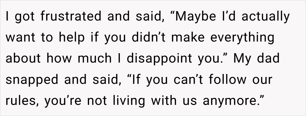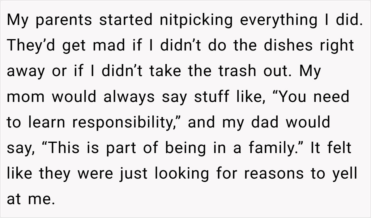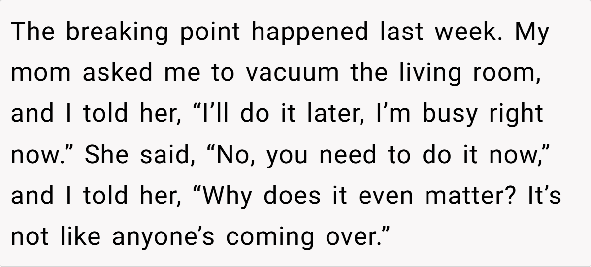 One of the biggest red flags in OP’s story is how quickly his parents kicked him out over a minor argument. This wasn’t about vacuuming—it was about control.