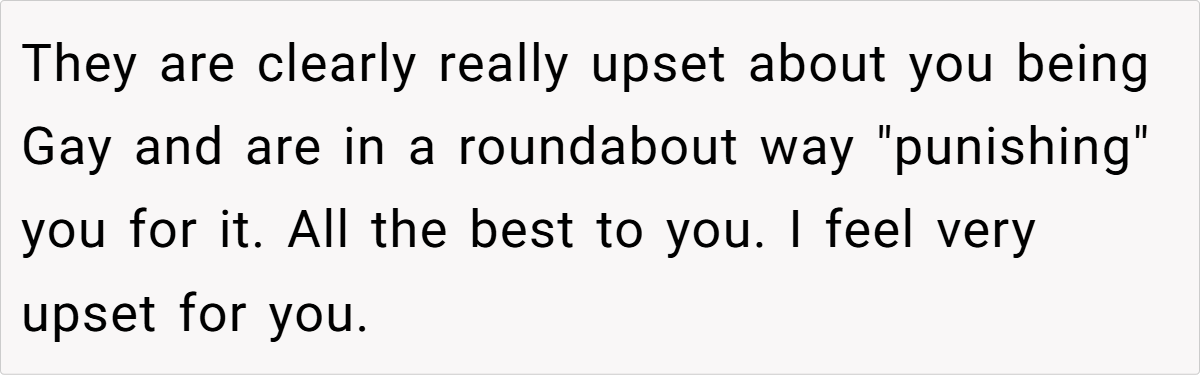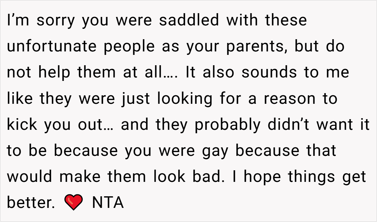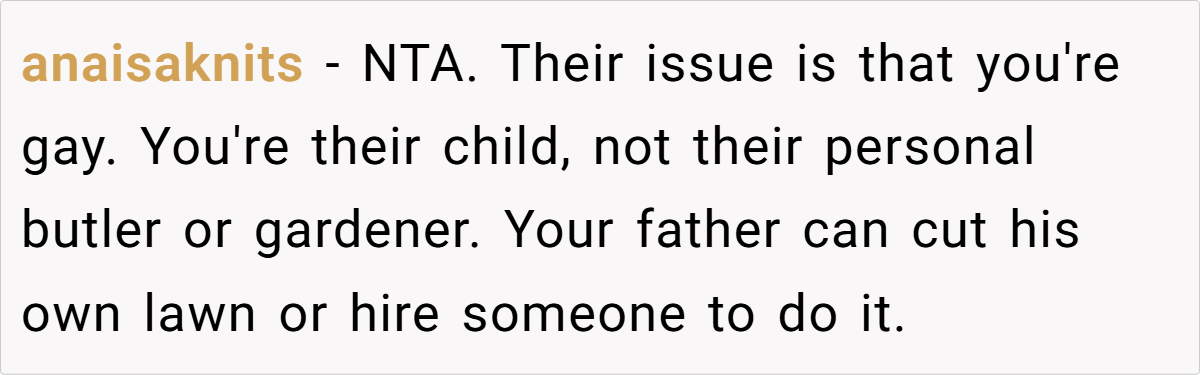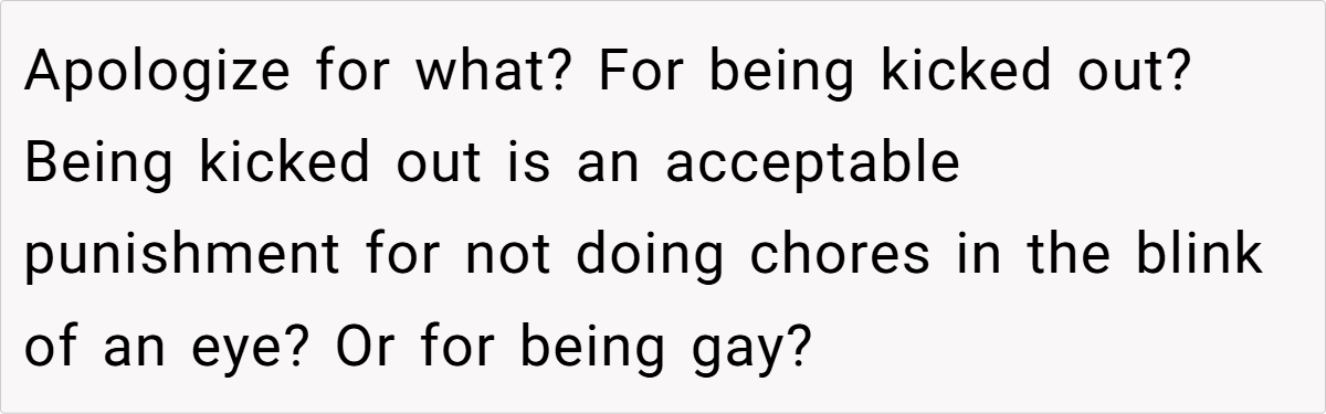According to Dr. Lindsay Gibson, author of Adult Children of Emotionally Immature Parents, parents who use conditional love often withhold support as a form of punishment. Instead of addressing their discomfort with OP’s sexuality directly, they likely used the chore argument as an excuse to push him out—while still expecting his labor.