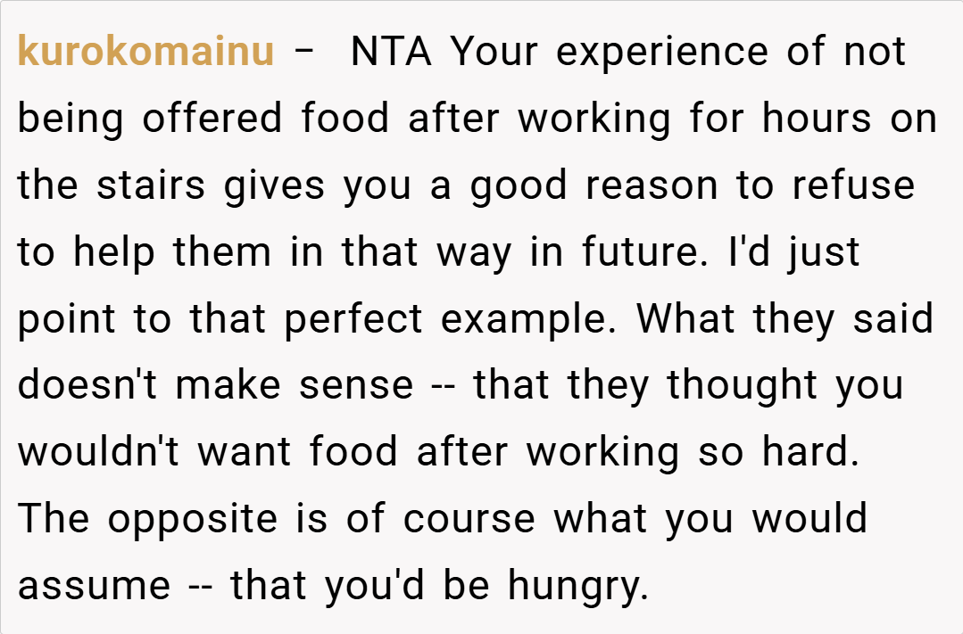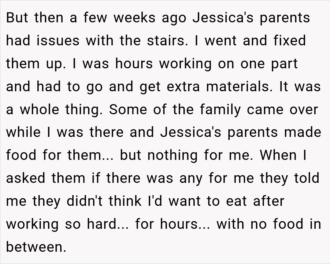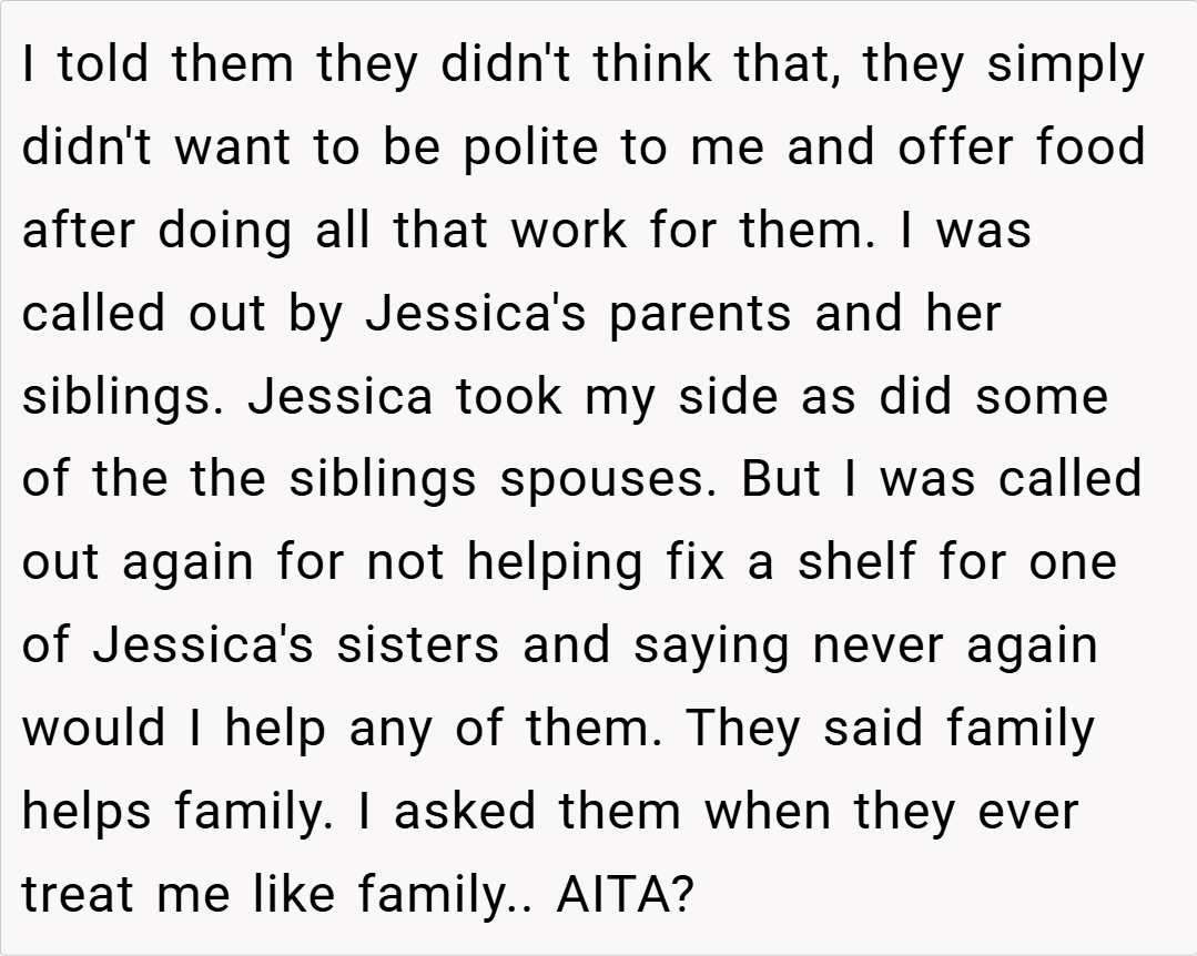 Over time, the subtle digs and dismissive behavior evolved into overt disrespect. The final straw came when, after fixing his in-laws’ problematic stairs for hours, he was left without even a morsel of food. When he finally confronted them, declaring that he would no longer offer his help, the ensuing backlash left him questioning whether his actions were justified. This post dives into the heartache of feeling perpetually undervalued within one’s own extended family.