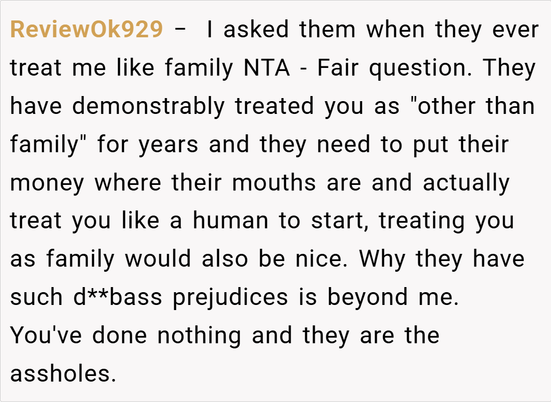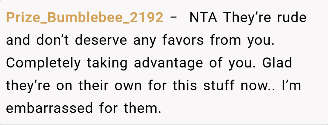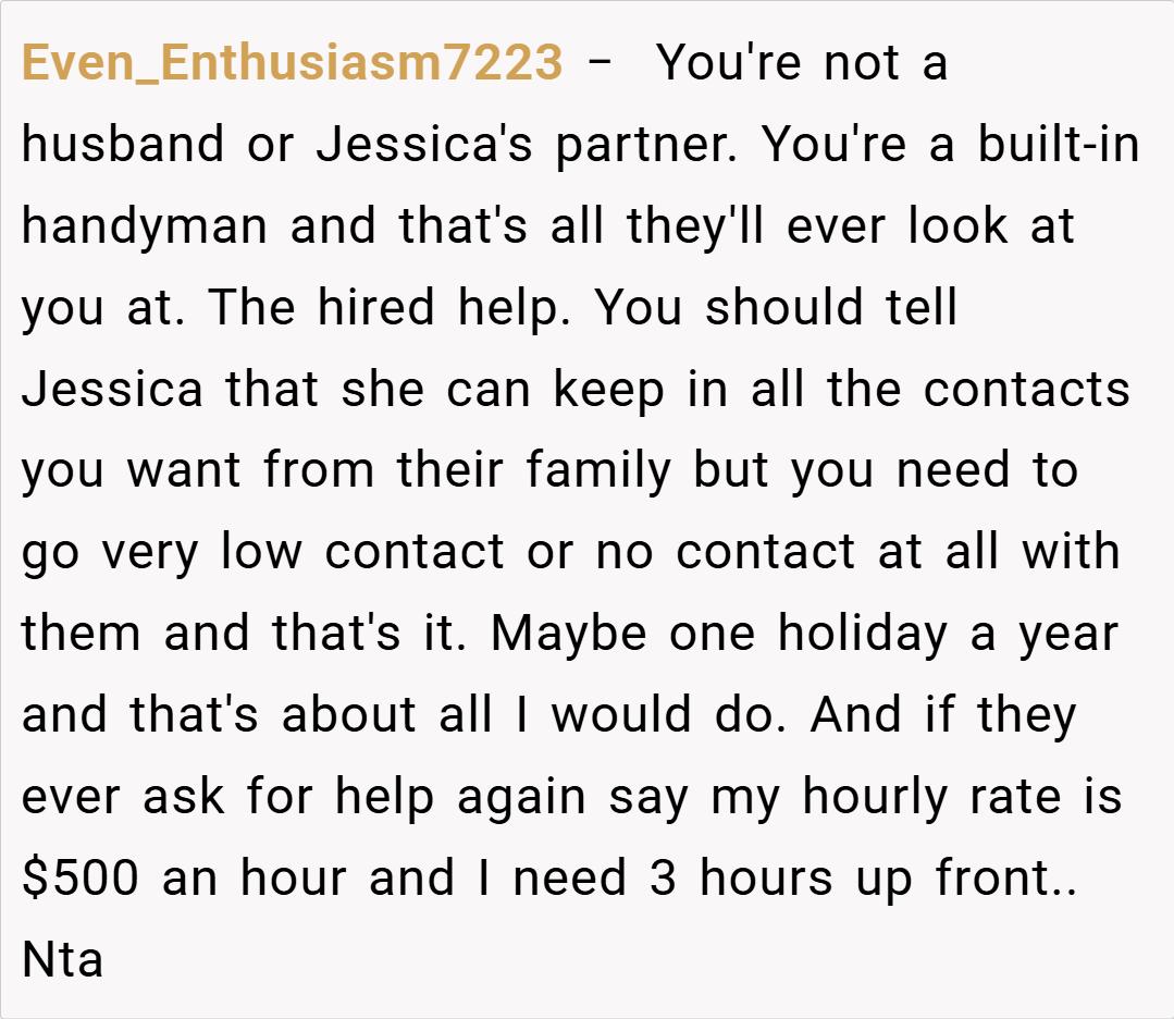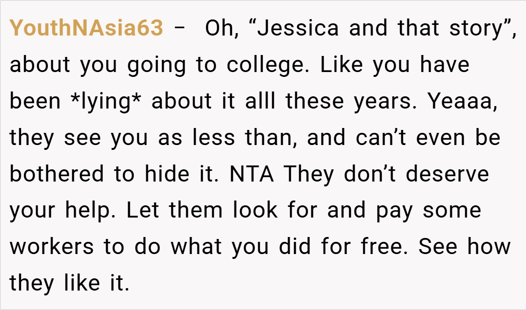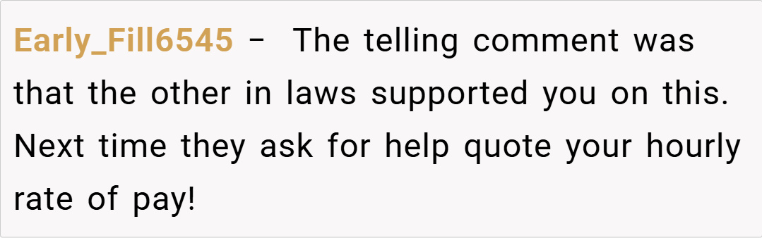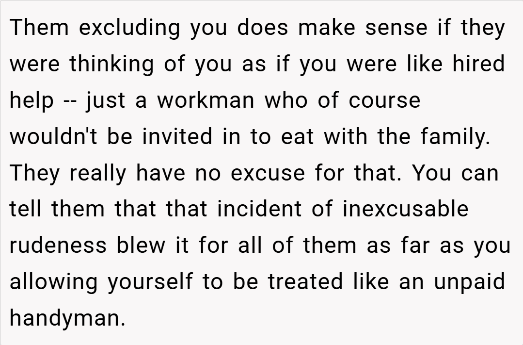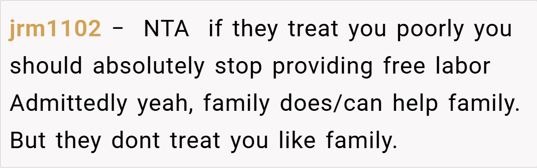 Here are some hot takes from the Reddit community—raw, witty, and filled with empathy. Many redditors agree that our storyteller has every right to stand up for himself after years of being treated like disposable labor. Comments range from “You’re not a hired hand—you’re family, and you deserve respect!” to calls for a strict “no free labor” policy. The overall consensus is clear: if they can’t treat you like a human being, they’re not truly family.