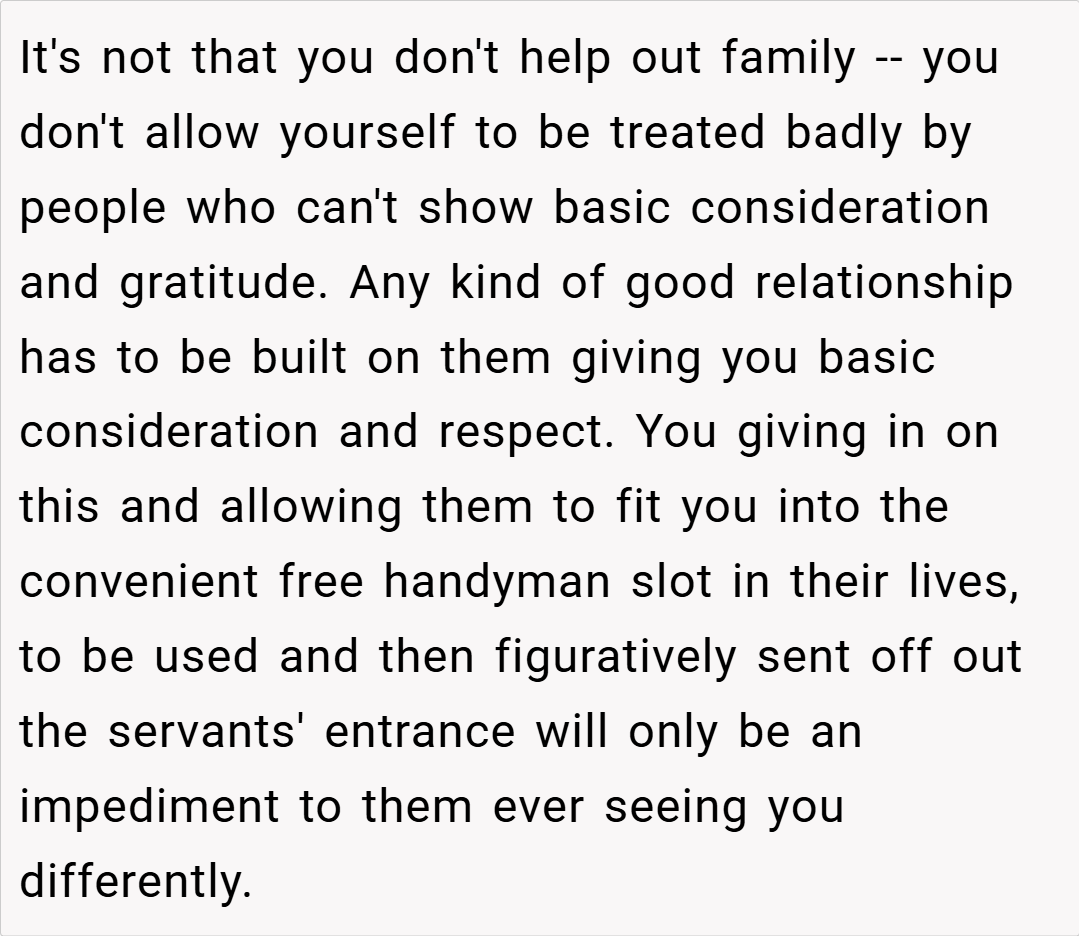Experts emphasize that when family relationships turn exploitative, establishing healthy boundaries is crucial for emotional well-being and self-respect. In this case, the storyteller’s experience of being treated solely as a “handyman”—despite his genuine contributions—reflects deep-seated biases and neglect. Psychologists note that persistent disregard for one’s efforts can erode self-esteem,