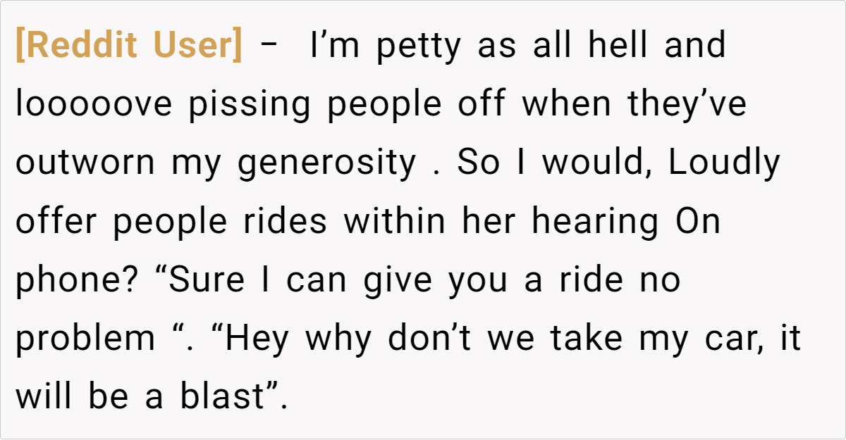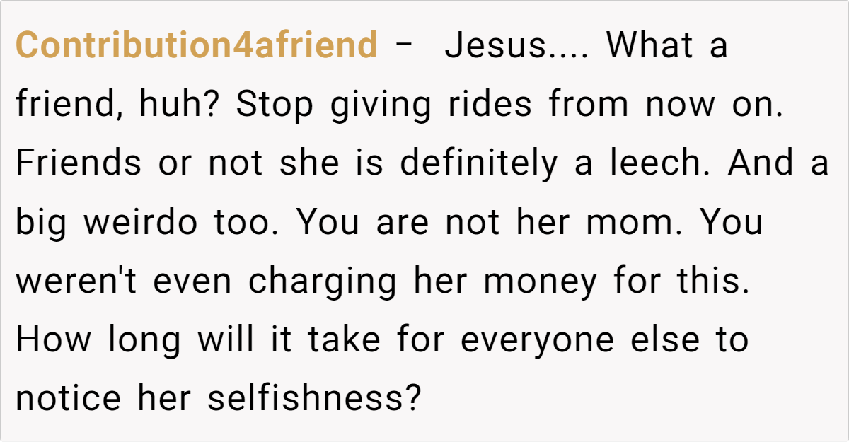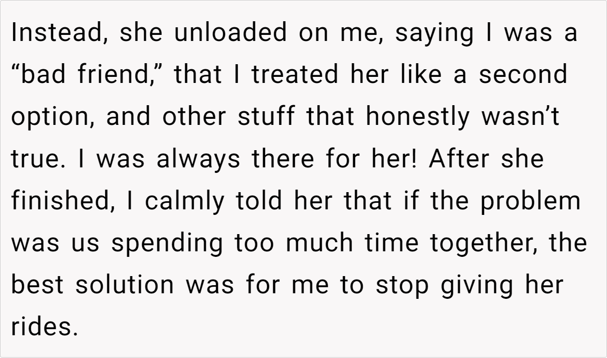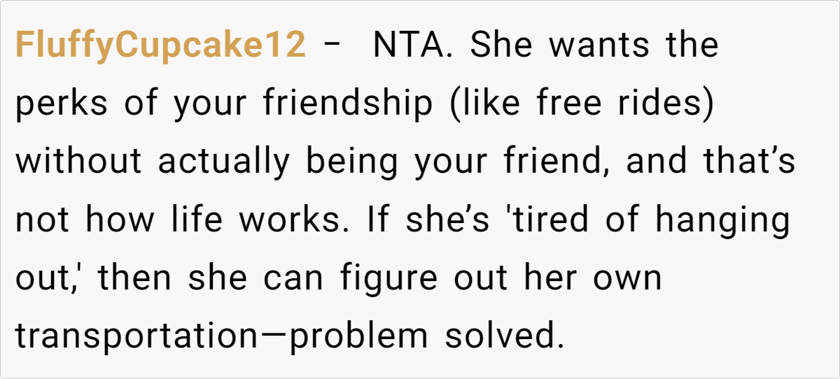 Ultimately, our narrator’s decision to stop giving rides is a stand for self-respect and healthy boundaries. While it might sting to see someone you once considered a friend now become a source of frustration, sometimes it’s necessary to prioritize your own happiness. In the end, friendship should never be a one-sided transaction, and every individual deserves to feel valued on their own terms. What do you think? Have you ever had to set similar boundaries with someone who took your generosity for granted? Share your thoughts and experiences in the comments below.