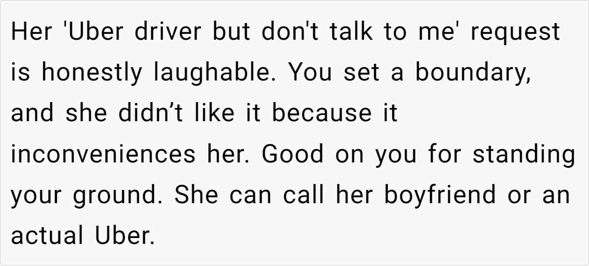 Moreover, experts highlight that communication—or the lack thereof—plays a critical role in maintaining healthy boundaries. When a friend or roommate is upset, many tend to avoid confrontation, which only allows resentment to build. The narrator’s decision to stop giving rides wasn’t merely about rejecting a logistical favor; it was a direct response to being emotionally manipulated.