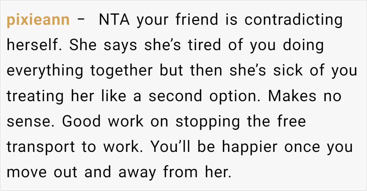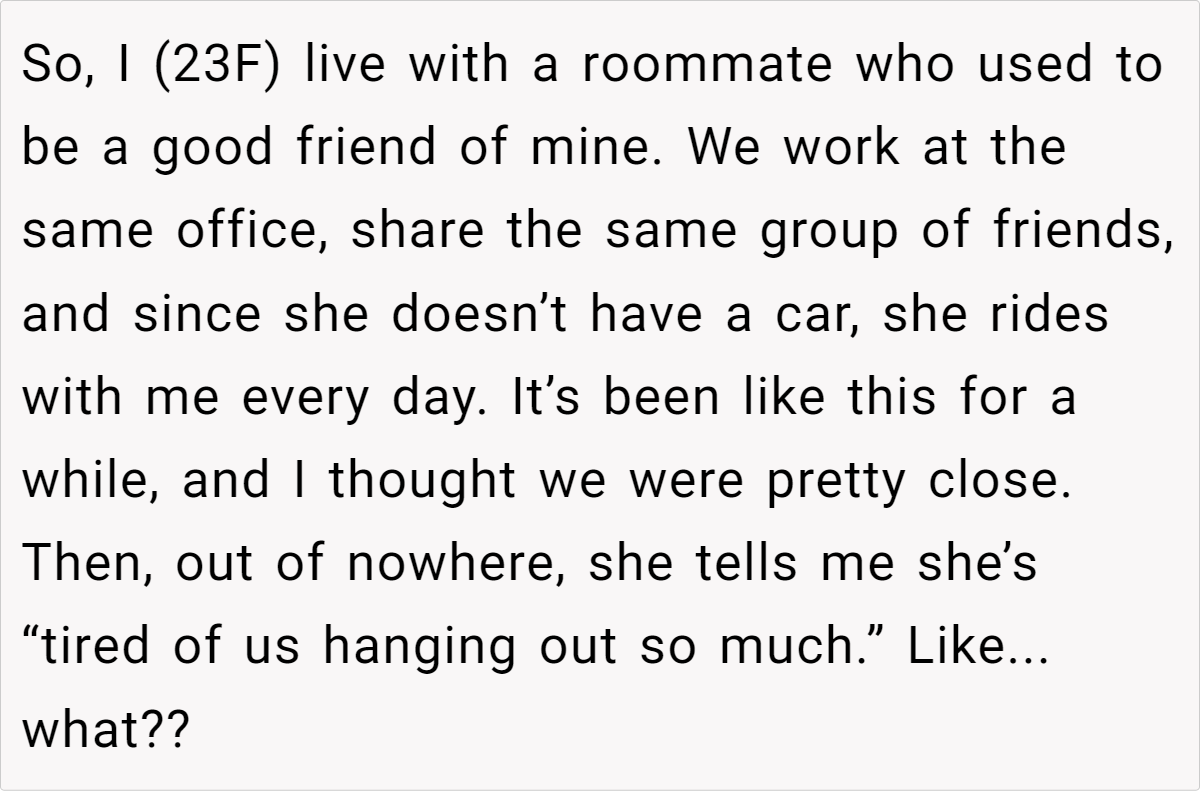 Imagine being the go-to ride provider for your roommate—a responsibility you accepted gladly, only to have that friendship take an unexpected nosedive. For one 23-year-old woman, the daily commute with her once-close roommate turned sour when the latter suddenly declared she was “tired of hanging out so much.” It left our narrator puzzled: if you don’t want to spend time with me, why rely on me for rides every day?