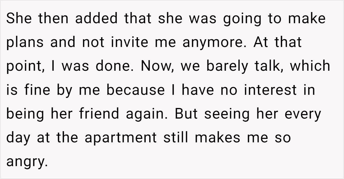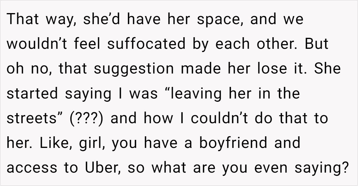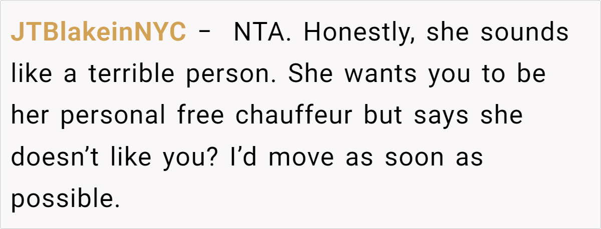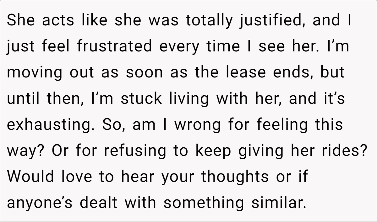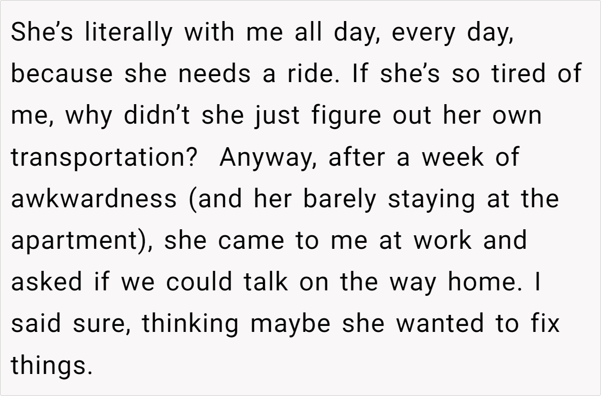 After weeks of awkward silences and mixed signals, the situation came to a head during a car ride home. Her roommate not only blamed her for being a “bad friend” but also insisted on a bizarre compromise—receiving rides while cutting off all social interaction. That proposal, laughably contradictory as it was, forced our narrator to draw a firm boundary: she would no longer give rides if it meant being forced into an unwanted friendship. The fallout? A toxic living situation that’s now making every shared glance in the apartment a daily reminder of a friendship gone wrong.