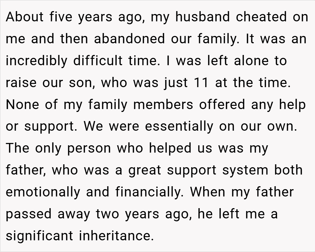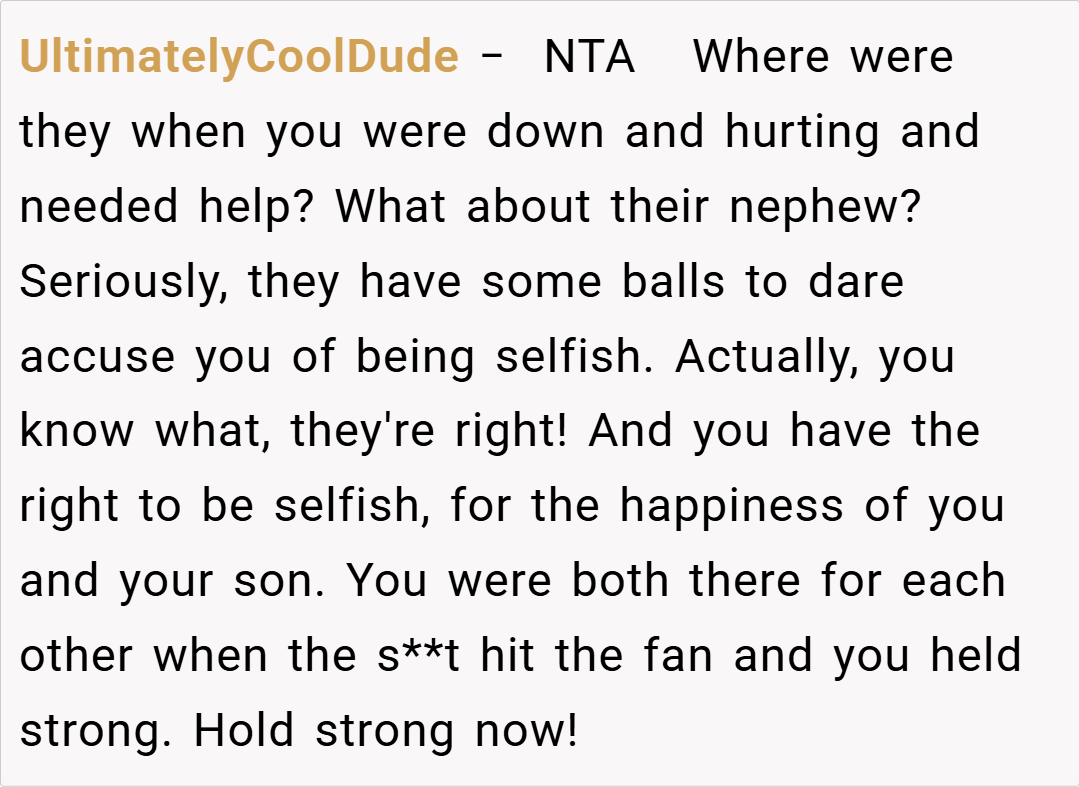 When he later passed away, his sizable inheritance allowed her to buy a home and build a stable life for them both. Now, as her extended family faces financial hardships and asks to move in, OP stands firm—after discussing the matter with her son, who remembers how unsupportive they were in their time of need. Despite accusations of selfishness from relatives, OP values her son’s well-being over forced family obligations. But is she the asshole for refusing to let her family move in?