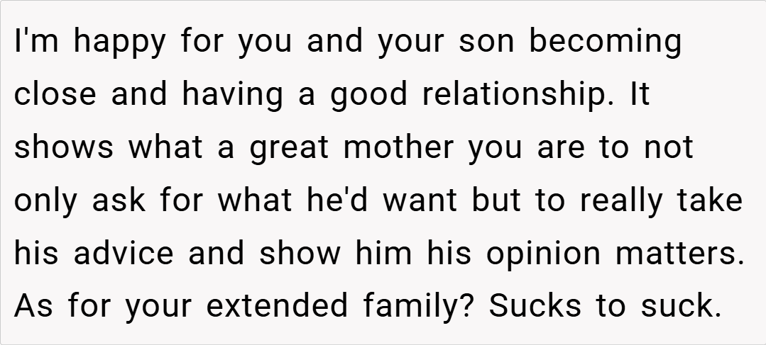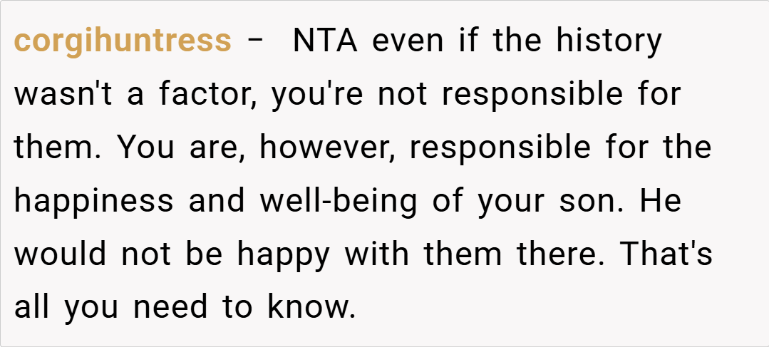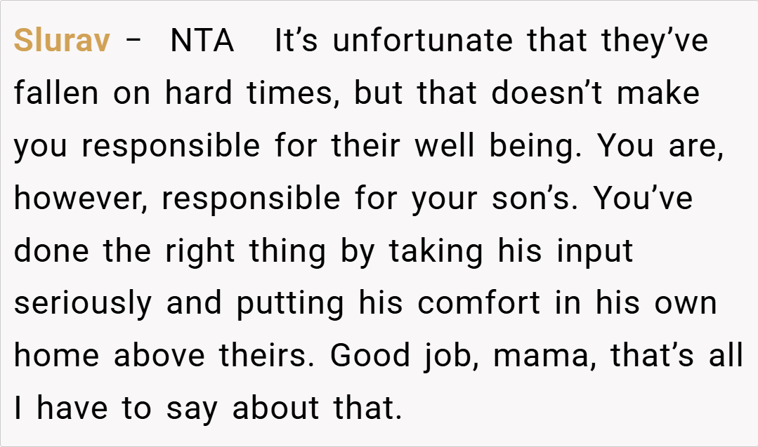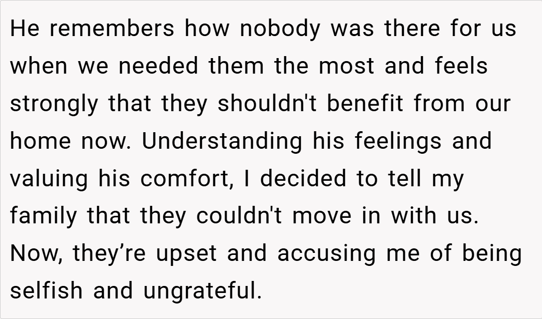 In the end, OP’s decision to refuse her family’s request to move in is driven by a need to protect her son’s emotional well-being and to avoid repeating painful family history. Although some may view it as ungrateful, many believe that prioritizing a child’s feelings—especially when they have been let down in the past—is entirely justified.
