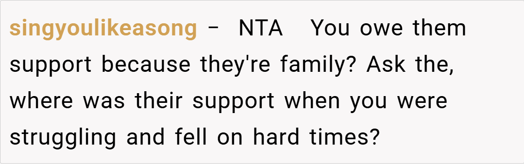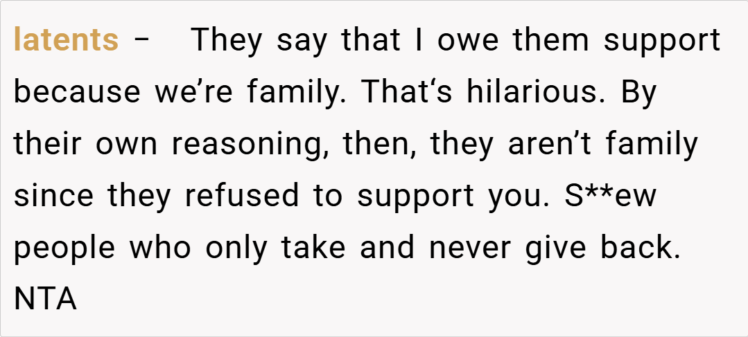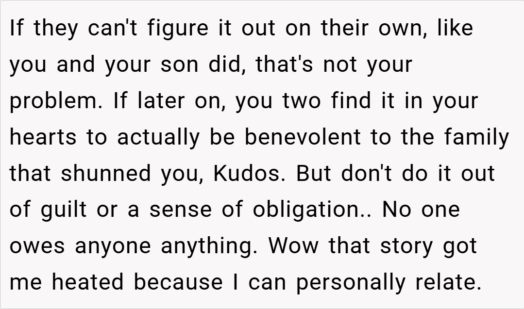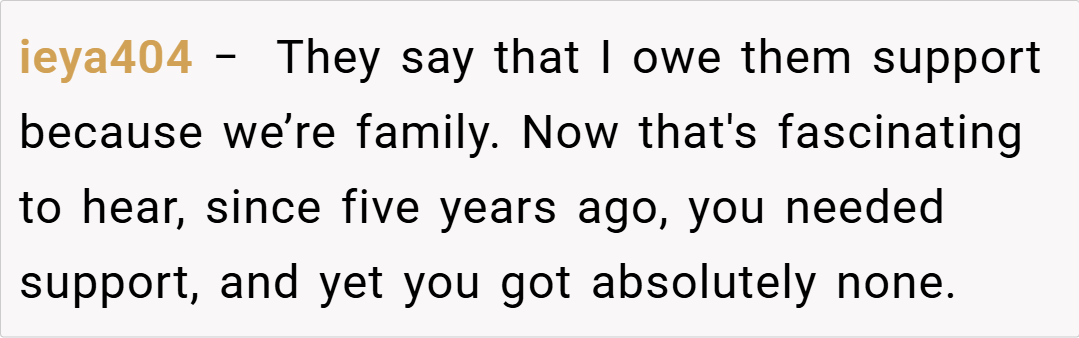Many redditors empathize with OP’s decision. “If your extended family failed you when you needed them, why should you be forced to open your home now?” one commenter wrote.